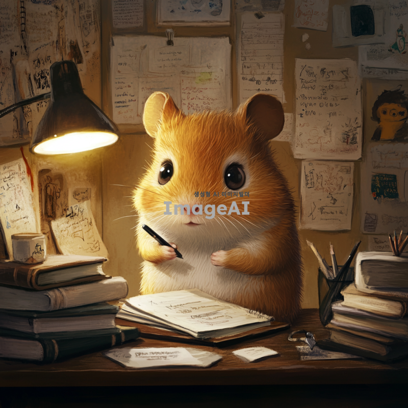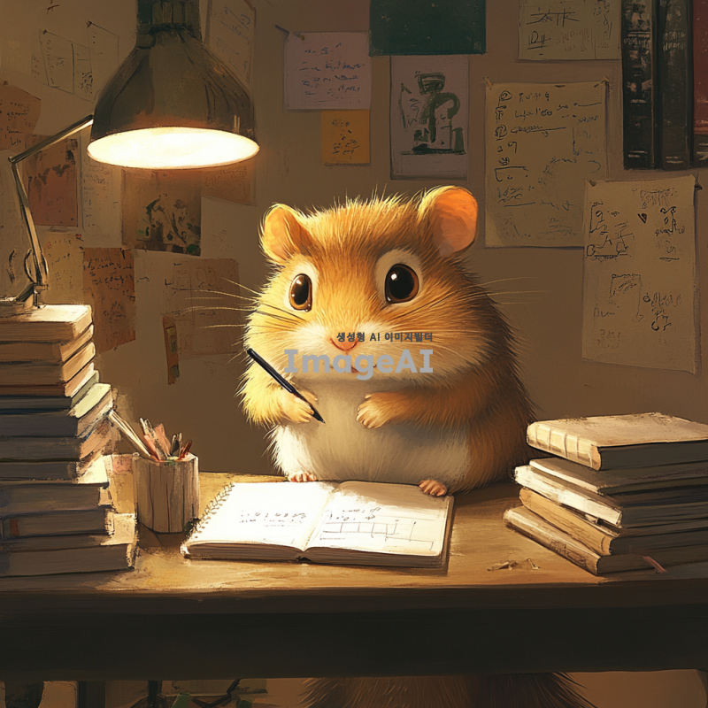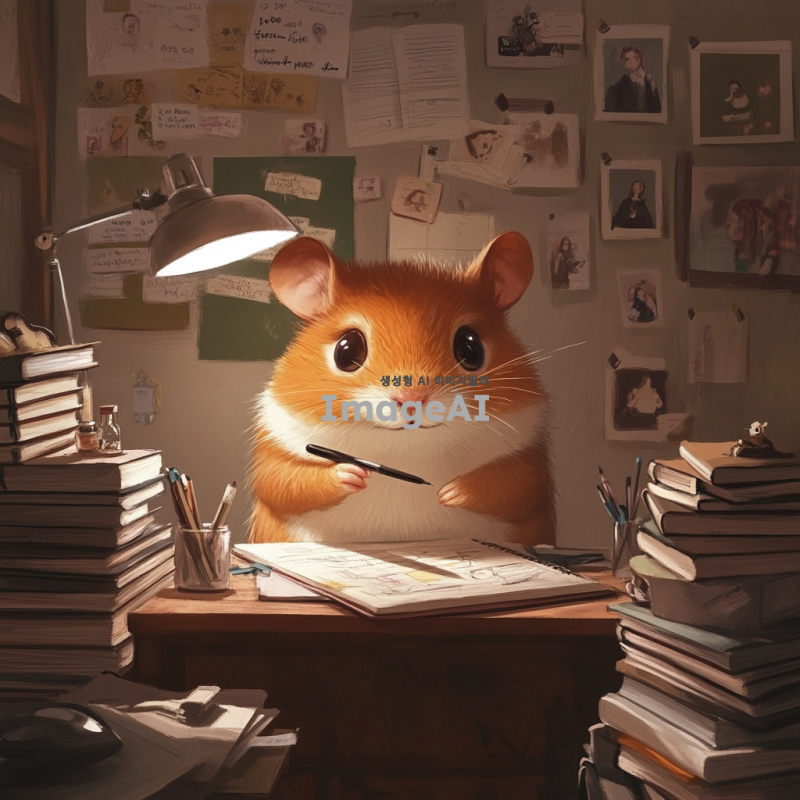 백색등 아래 작은 책상에 앉아 있는 날카로운 눈매의 햄스터, 펜을 잡고 있으며, 주변에는 여러 권의 책과 노트가 쌓여 있음. 벽에는 영감이 될 만한 그림과 메모들이 붙어 있음. 창의적이고 아늑한 분위기, 집중하고 있는 모습의 햄스터. 일러스트 보다는 만화 캐릭터에 가까웠으면 좋겠다