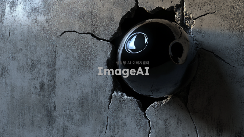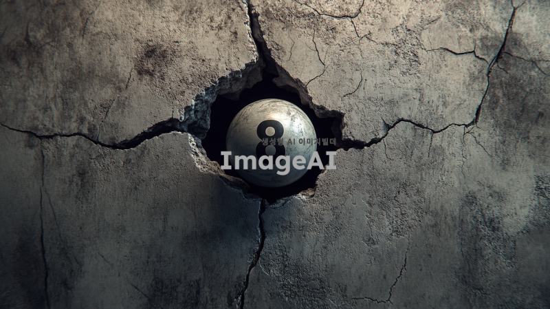 벽에 박힌 8번 당구공, 벽에 생긴 균열, 사실적인 디테일, 어두운 조명, 콘크리트 질감, 공의 음영과 반사, 균열의 깊이와 형태, 정적인 분위기.