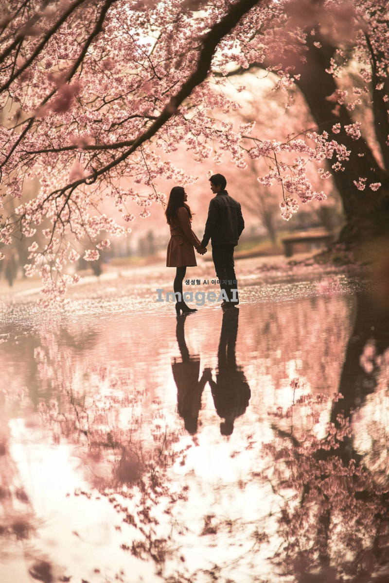 벚꽃나무 아래에서 손을 잡고 있는 남녀, 잔잔한 연못에 비치는 어린 남녀의 모습, 부드러운 봄날의 분위기, 따뜻한 햇살과 벚꽃잎이 흩날리는 장면, 로맨틱하고 평화로운 느낌, 자연과 어우러진 사랑스러운 순간.