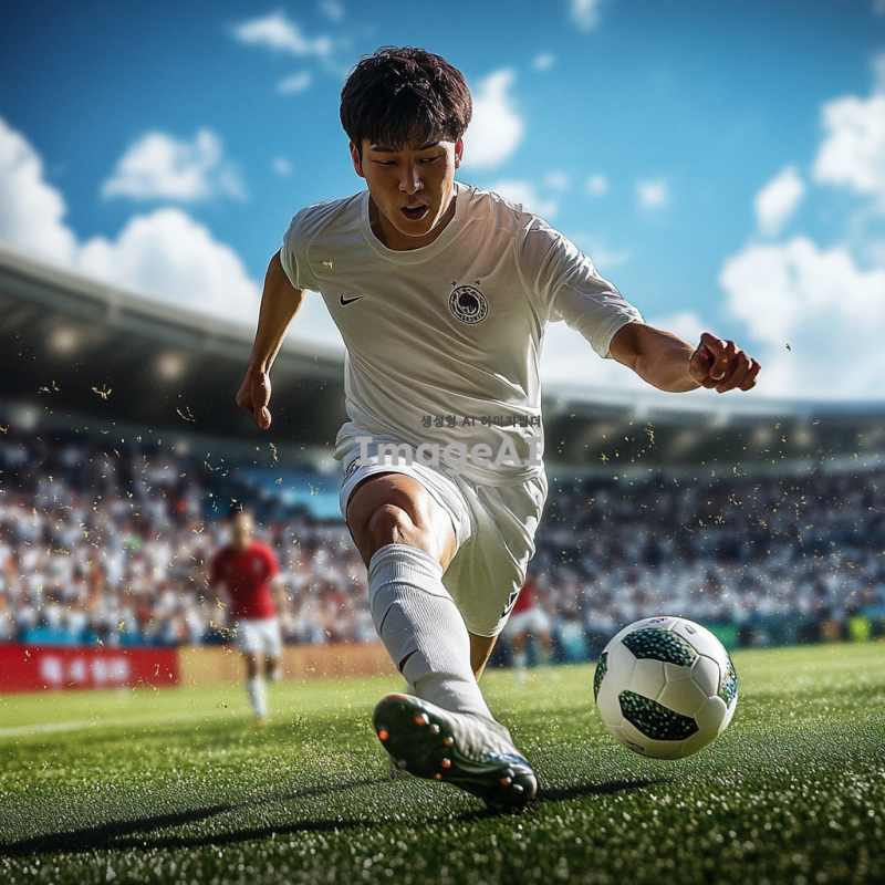 20대 한국인 남성 축구선수가 경기장에서 역동적으로 공을 차는 순간, 푸른 잔디 위에서 땀에 젖은 흰 유니폼을 입고 있으며, 배경에는 환호하는 관중과 푸른 하늘이 펼쳐져 있는 장면, 선수의 얼굴은 강한 집중력과 열정이 담겨 있는 모습, 축구화는 최신형 디자인으로 빛나고 있음.