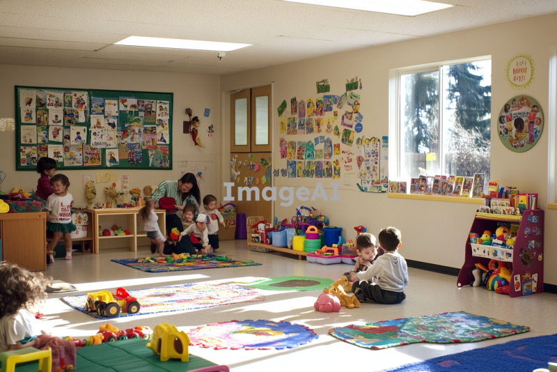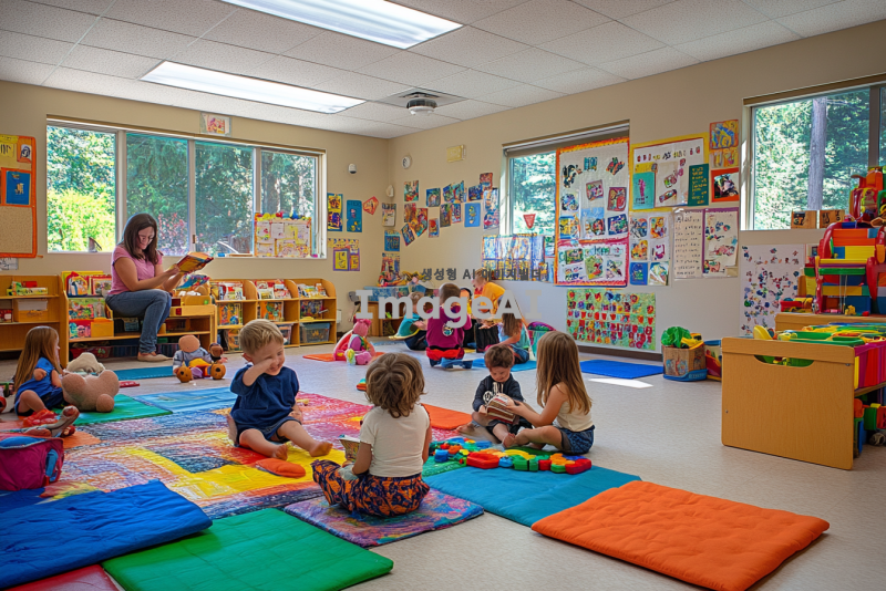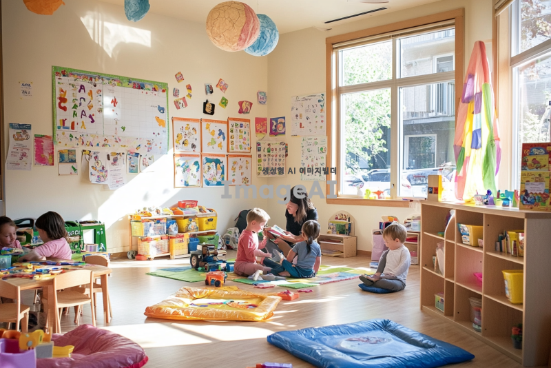 밝고 화사한 유치원 교실, 다양한 인종의 아이들이 함께 놀이를 즐기고 있는 모습, 벽에는 알록달록한 그림과 알파벳 포스터가 걸려 있고, 바닥에는 부드러운 매트와 장난감들이 놓여 있는 장면, 선생님이 아이들과 함께 웃으며 책을 읽고 있는 따뜻한 분위기, 창문으로 햇살이 부드럽게 들어오는 모습, 전체적으로 아늑하고 안전한 느낌.