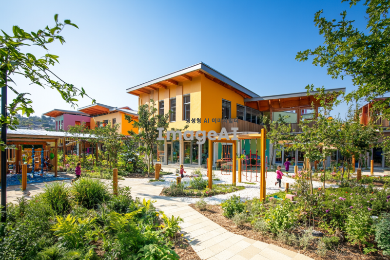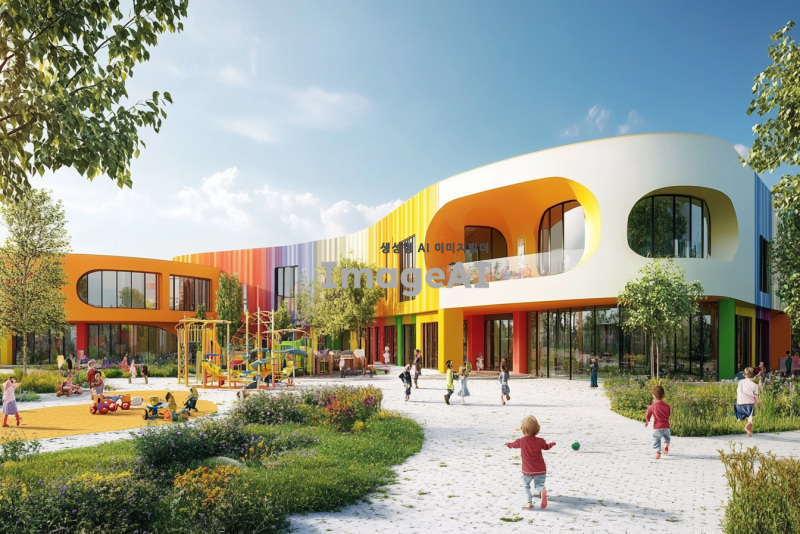 밝고 친근한 유치원 외부, 알록달록한 색상의 건물, 놀이기구와 어린이들이 뛰어노는 정원, 푸른 하늘과 햇살이 비치는 풍경, 안전하고 환영하는 분위기, 다양한 나무와 꽃들이 어우러진 정원, 미소 짓는 어린이들, 창의적인 디자인의 건축물, 자연과 조화를 이루는 환경.