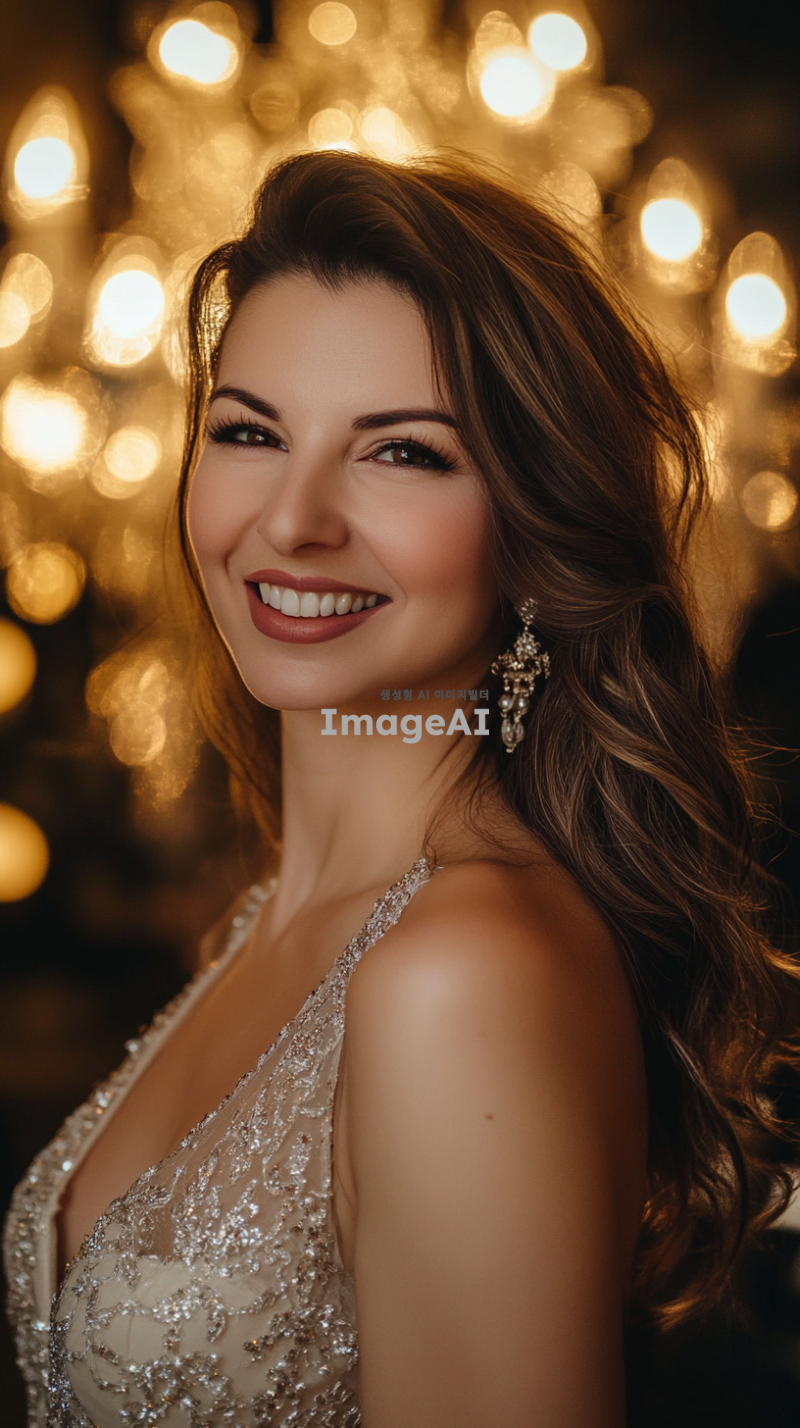 매혹적이고 우아한 분위기의 여성, 부드러운 조명 아래에서 긴 웨이브 머리, 세련된 드레스 착용, 미소를 짓고 있는 모습, 고급스러운 배경, 여성스러운 포즈, 자연스러운 메이크업, 화려한 액세서리로 포인트를 준 스타일.