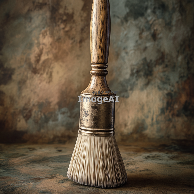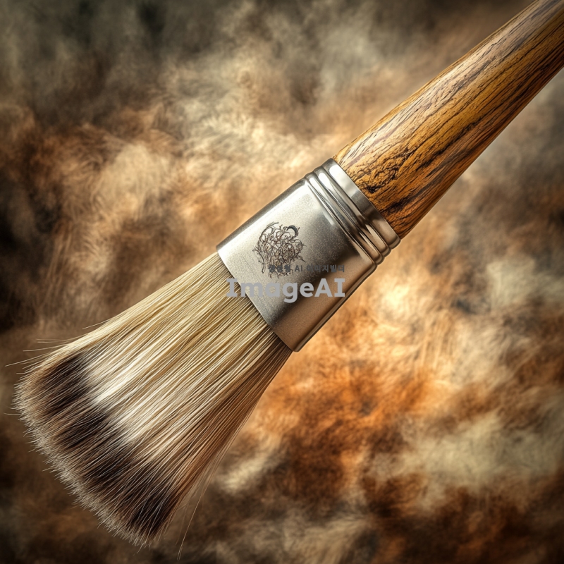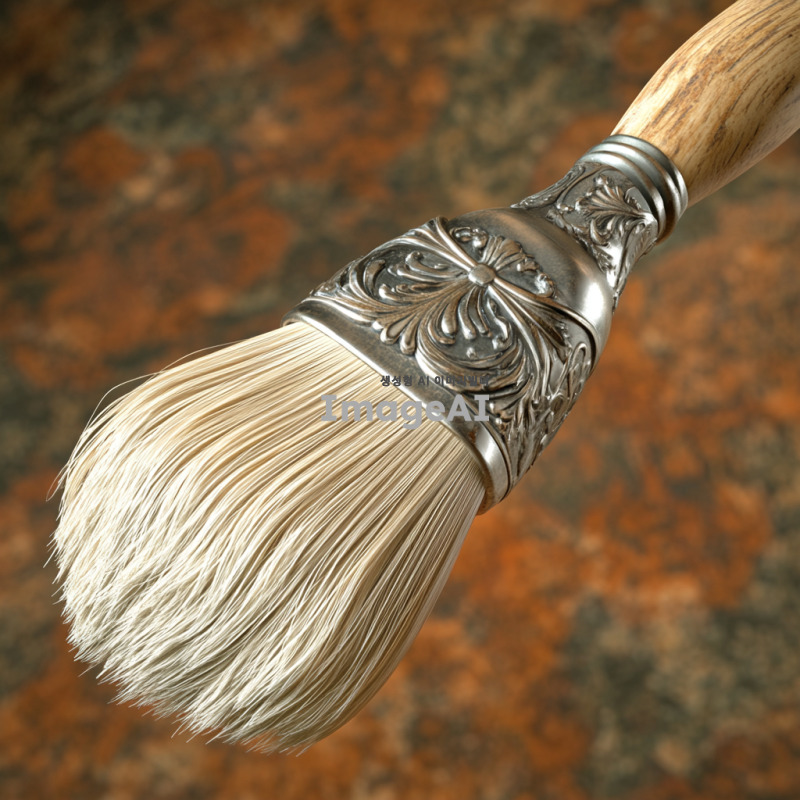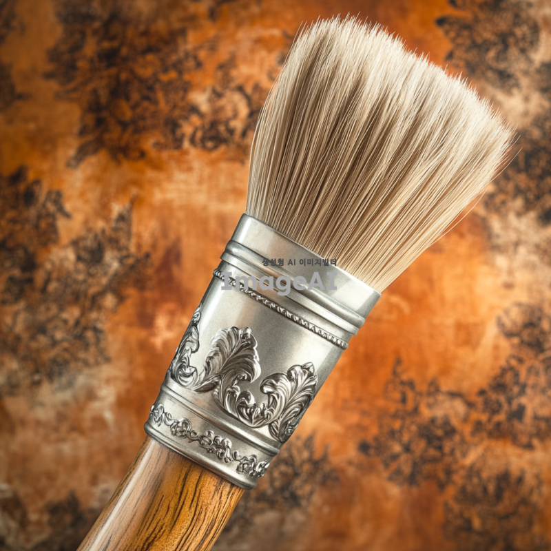 고급스러운 페인트 칠 용 붓, 나무 손잡이, 부드러운 천연모, 손잡이에 세련된 금속 장식, 정교한 디테일, 예술적이고 우아한 디자인, 따뜻한 조명 아래 놓인 모습, 클래식한 배경, 고해상도, 섬세한 텍스처, 정물화 스타일.