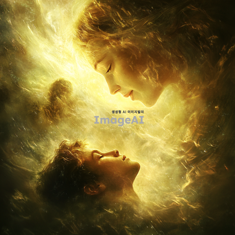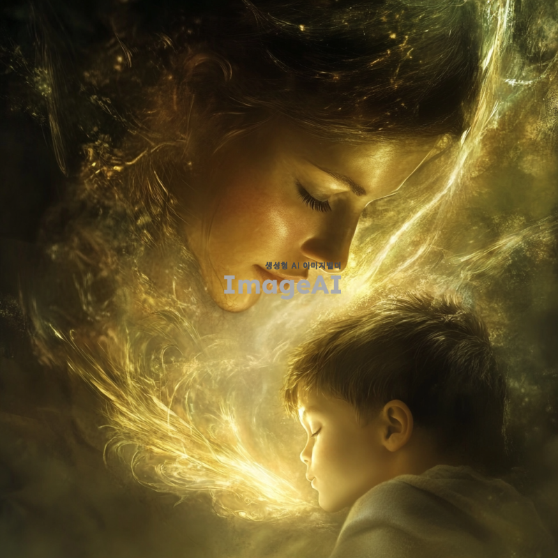 따뜻하고 부드러운 빛으로 둘러싸인 하늘 위에서 어머니가 아들을 지켜보는 장면. 어머니의 얼굴에는 깊은 사랑과 안타까움이 담겨 있으며, 그녀의 눈에는 아들을 향한 희망이 반짝입니다. 아들은 땅 위에서 고개를 숙이고 있지만, 그의 주위에는 어머니의 사랑이 은은한 빛으로 감싸고 있어 위로받고 있는 듯한 느낌을 줍니다. 하늘과 땅 사이에는 희미한 연결고리가 있어, 둘 사이의 끊어지지 않는 깊은 유대감을 상징합니다. 전체적인 분위기는 감동적이고 따뜻하며, 어머니의 사랑이 아들에게 닿아 그의 마음속에 작은 희망의 불씨를 지피고 있는 장면을 표현합니다.