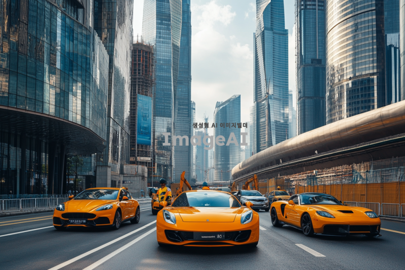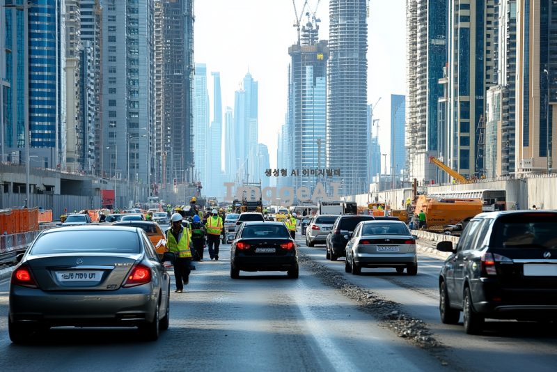 도심 속 고층건물 앞 도로에 고급 자동차들이 줄지어 지나가고 있으며, 도로 옆에는 지하철 공사현장에서 일하는 공사 관계자들이 안전모를 쓰고 작업하는 모습. 현대적이고 세련된 도시 풍경, 바쁜 일상 속에서의 조화로운 장면.