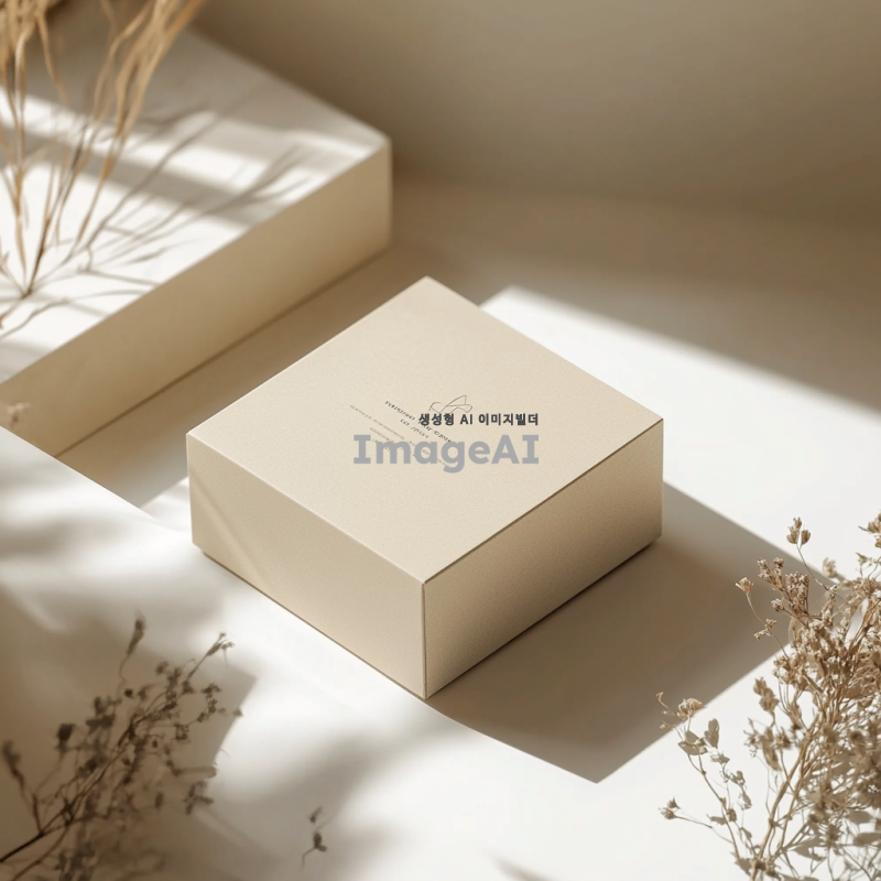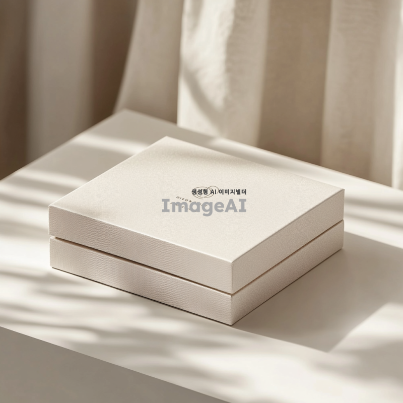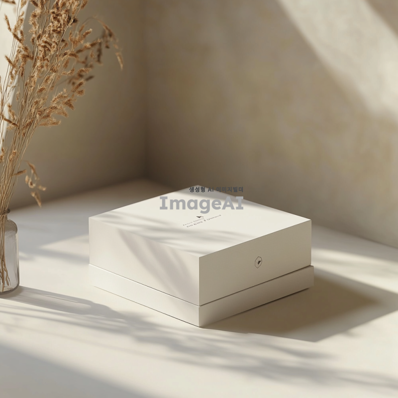 상자 모양의 목업 이미지, 깔끔하고 현대적인 디자인, 자연광이 비치는 스튜디오 환경, 고급스러운 질감의 종이 재질, 부드러운 그림자와 하이라이트, 상자 위에 간결한 로고와 텍스트, 중립적인 색조, 다양한 각도에서 촬영된 모습, 제품의 세부 사항을 강조하는 구도.