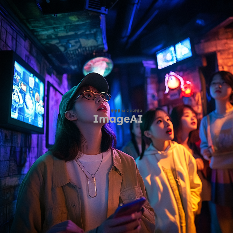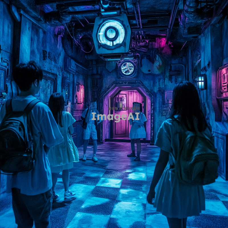 애버랜드 테마파크의 화려한 배경 속에서 오징어게임의 상징적인 요소들이 조화롭게 어우러진 방탈출 게임 장면, 참가자들이 긴장감 속에서 단서를 찾고 퍼즐을 풀고 있는 모습, 주변에는 오징어게임의 유명한 상징물들이 배치되어 있으며, 밝고 활기찬 테마파크의 분위기와 오징어게임의 독특한 스타일이 결합된 독창적인 게임 환경, 참가자들이 다양한 연령대와 복장을 하고 있으며, 각기 다른 감정과 표정을 짓고 있는 모습.