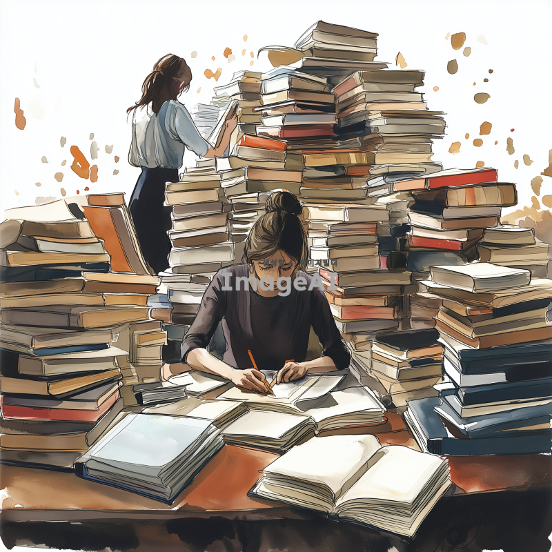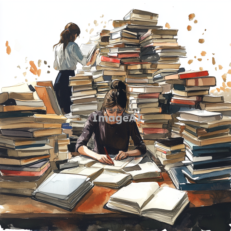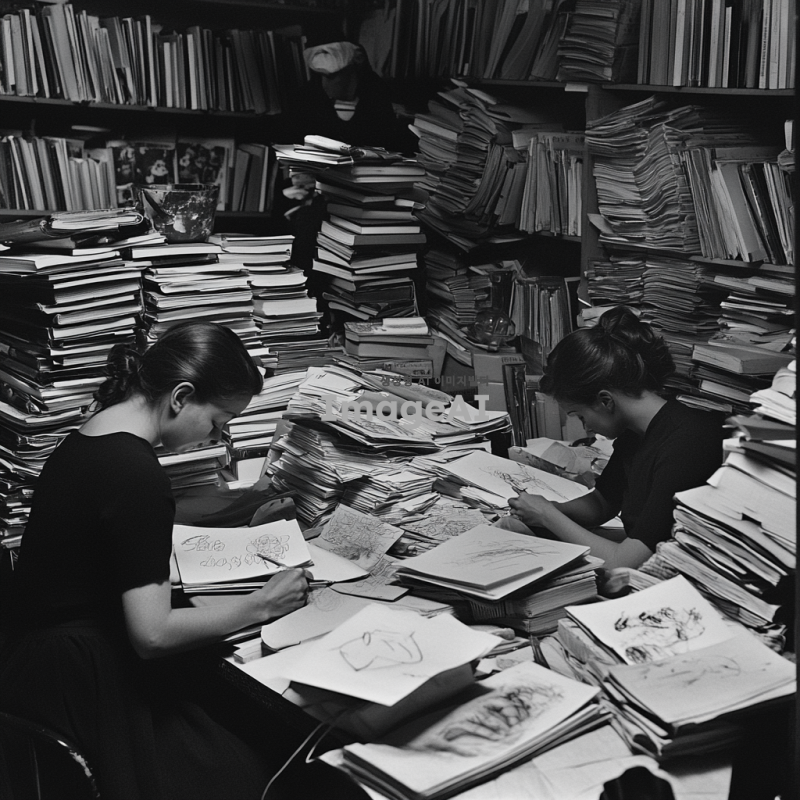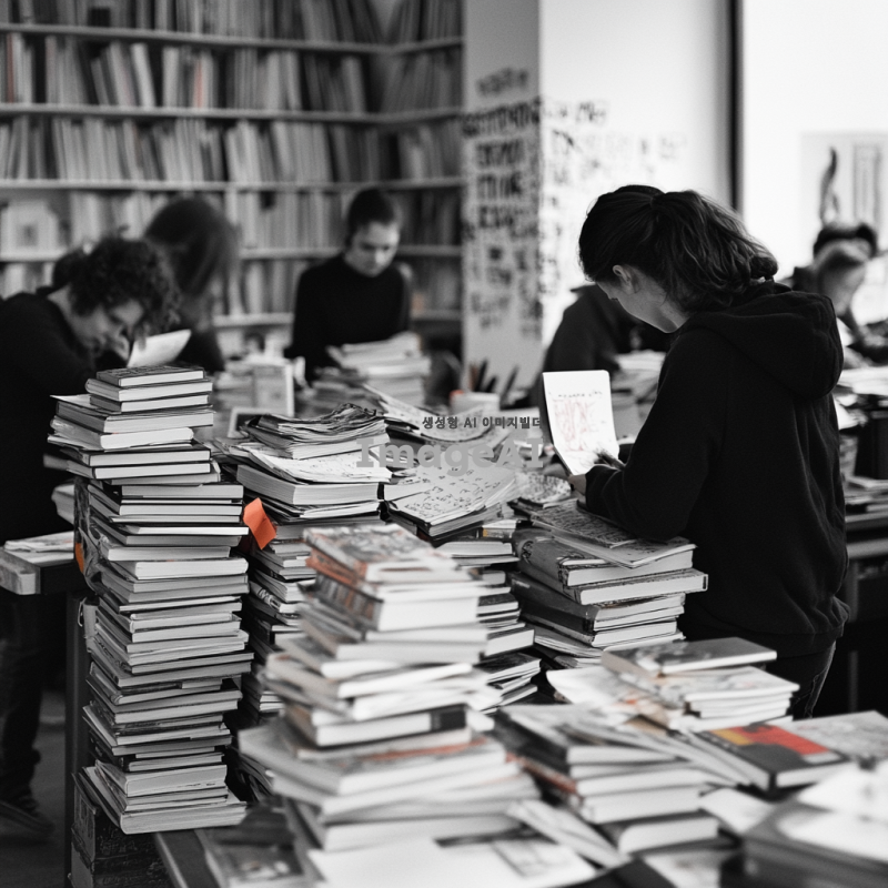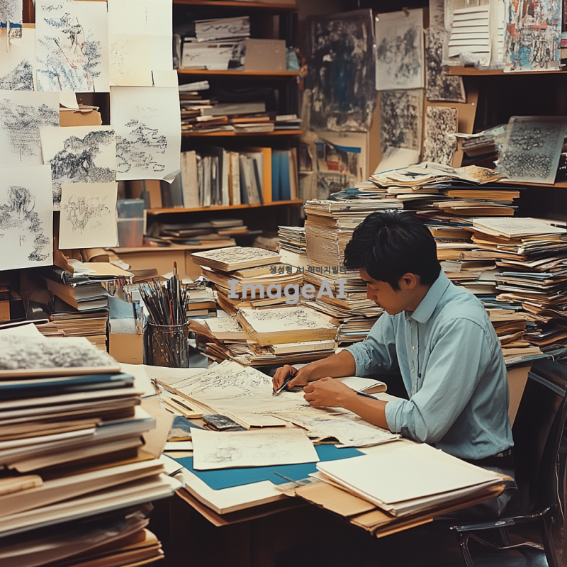 책 속에 쌓인 편집자, 그림 그리는 작가