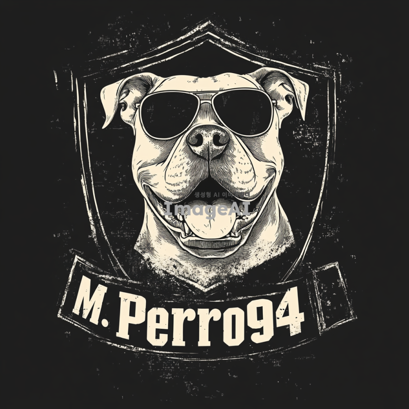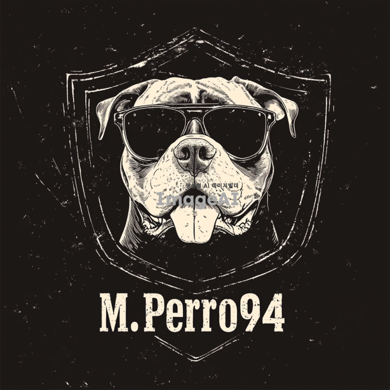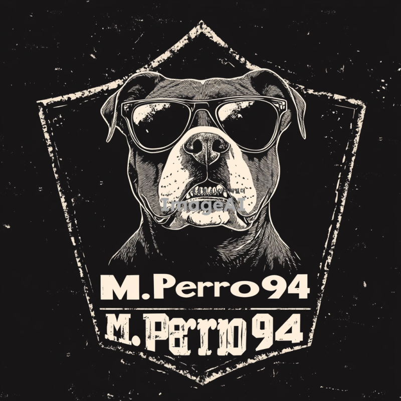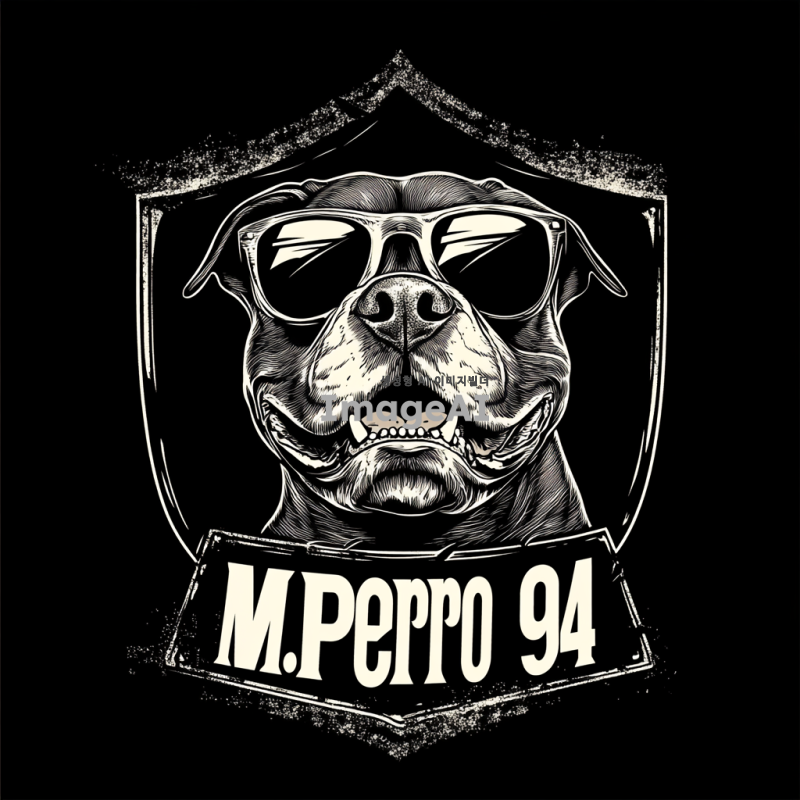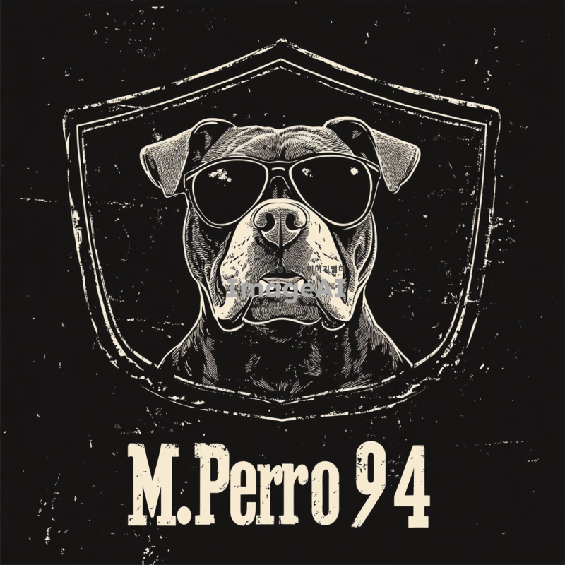 로고는 그런지 스타일로, "M.Perro94"라는 텍스트와 함께 입 다물고 이빨이 튀어나와 있는 핏불이 선글라스를 쓰고 LAPD배지 모양 안에 있는 디자인입니다. 단색 배경에 티셔츠 프린트용 로고 디자인으로, 벡터 아트, 간단한 선 아트, 검은색 배경에 흰색 글씨가 위에 있는 2D 벡터 그래픽입니다.