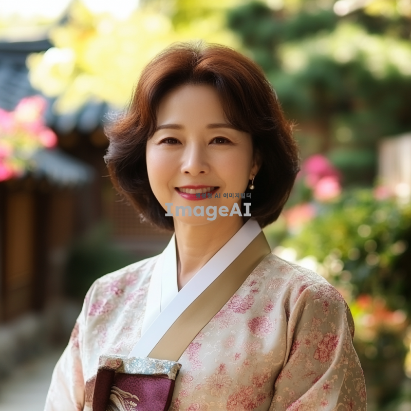 50대 한국인 여성, 자연스러운 미소, 짙은 갈색 머리, 단정한 중간 길이의 헤어스타일, 전통적인 한복 착용, 따뜻하고 친근한 분위기, 밝고 부드러운 조명, 배경은 한국의 전통적인 정원, 꽃과 나무가 어우러진 평화로운 환경.