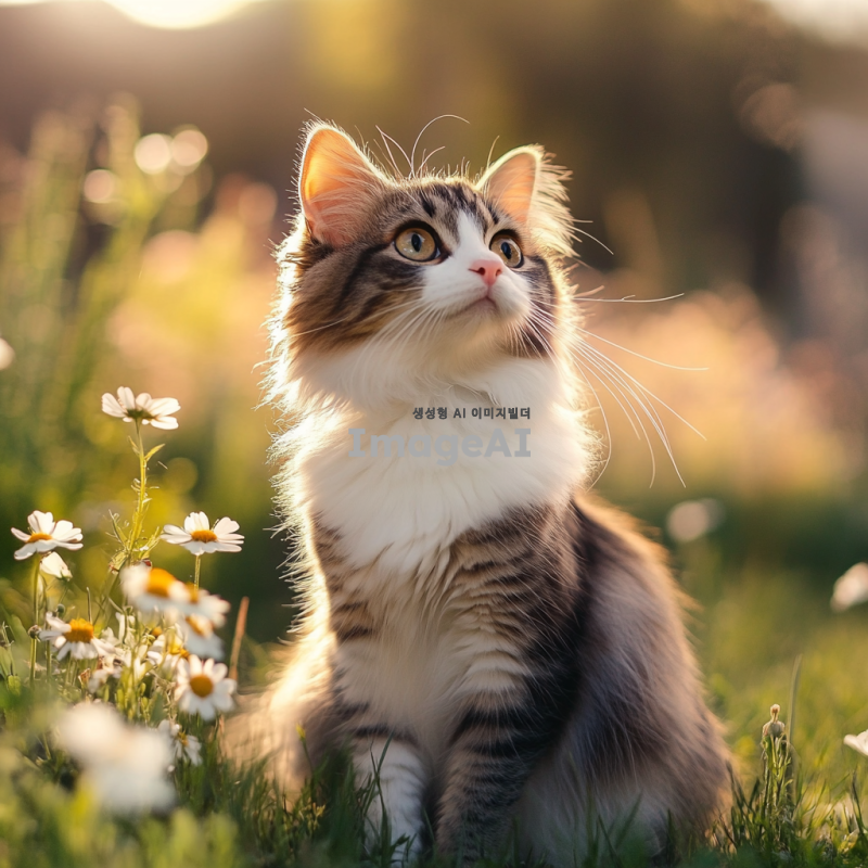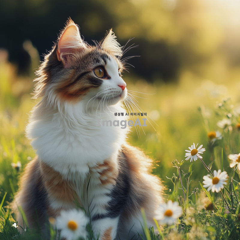 따뜻한 햇살 아래 잔디밭에 앉아 있는 귀여운 고양이, 부드러운 털이 바람에 살랑이는 모습, 밝고 생동감 있는 색감, 고양이의 큰 눈이 반짝이고 호기심 가득한 표정, 주변에는 작은 꽃들이 피어 있는 평화로운 정경.