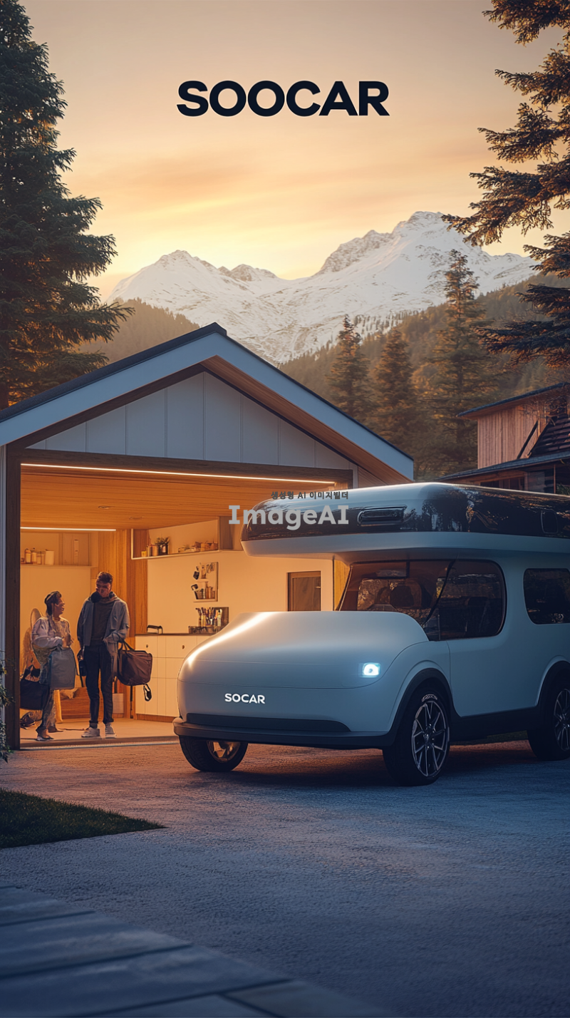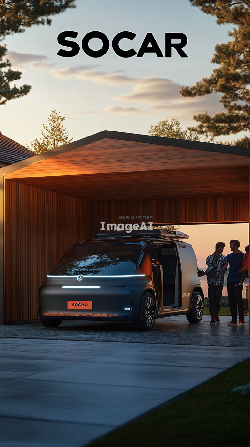 현대적이고 세련된 디자인의 캠핑 자동차, 주택 차고에 주차 되어있는 모습, 주택 차고에 "SOCAR" 적힌 모습, 노을지는 시각, 주변에 다양한 주택과 자연 경관 조화, 깔끔하고 심플한 외부 인테리어, 사용자 친화적인 첨단 기술 장치, 다양한 색상 옵션, 가족과 친구들이 함께 캠핑 짐을 들고 웃는 모습, 자유롭고 행복한 여행에 즐거움을 표현하는 장면.