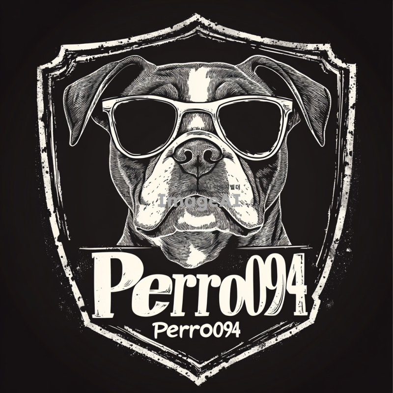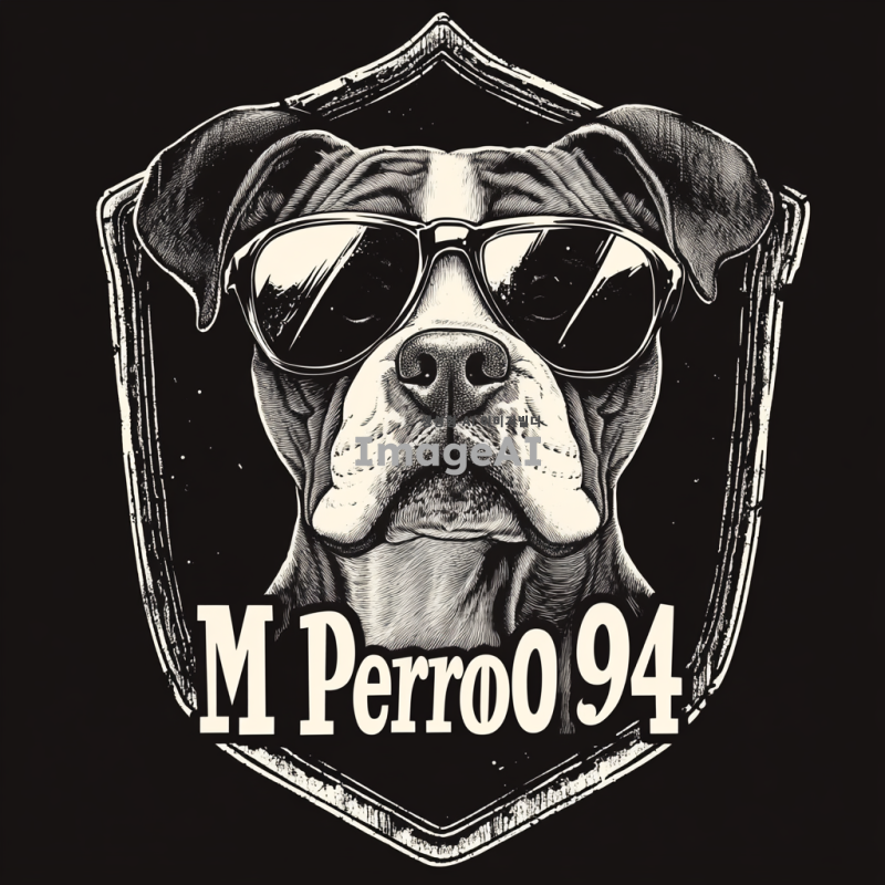 로고는 그래픽 스타일로, "M Perro094"라는 텍스트와 선글라스를 쓴 핏불 강아지,목 근육이 조금 더 크고, 빈티지 방패 모양의 엠블럼 스타일 디자인, 흑백 색상 팔레트, 근육의 세부 묘사가 포함된 디자인입니다.
