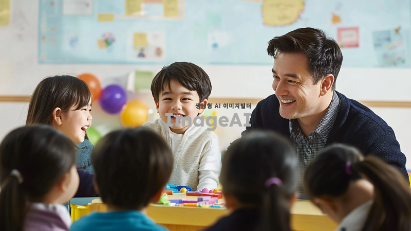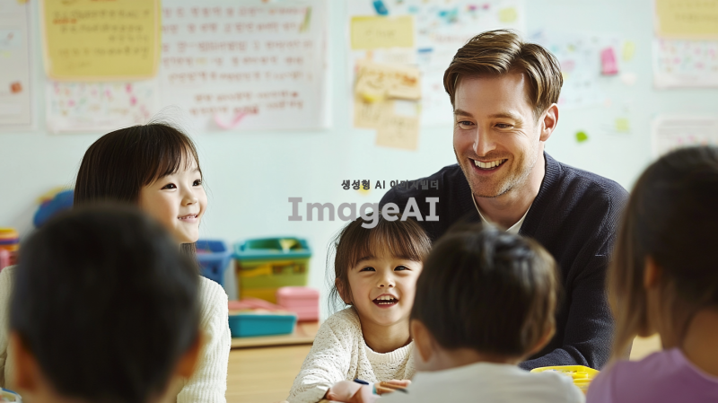 30대 미국인 남성이 한국인 유치원생 5명과 함께 밝은 미소로 대화하는 장면. 남성은 친근하고 따뜻한 인상을 주며, 아이들은 즐겁고 호기심 가득한 표정을 짓고 있다. 배경은 유치원 교실로 꾸며져 있으며, 다양한 색상의 장난감과 학습 도구들이 놓여 있어 활기찬 분위기를 자아낸다. 교실 안은 밝고 따뜻한 조명으로 환하게 비추어져 있다.
