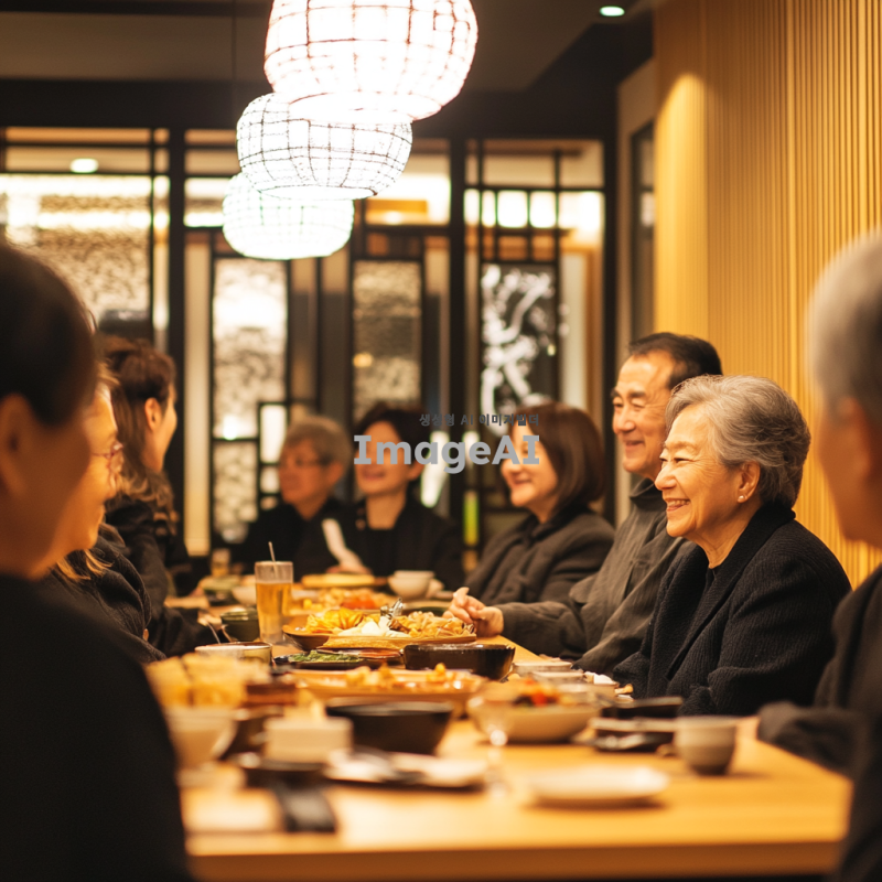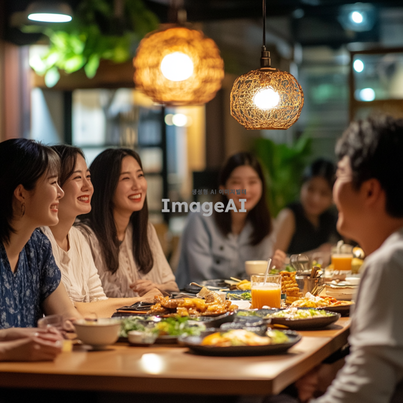 현대적인 한국식 레스토랑 내부, 긴 테이블에 둘러앉은 다양한 연령대의 사람들이 즐거운 대화를 나누고 있는 모습, 테이블 위에는 전통적인 한국 음식과 음료가 가득하고, 따뜻하고 환영하는 분위기의 조명, 사람들은 캐주얼한 옷차림으로 서로 웃고 있으며, 배경에는 한국 전통 장식이 약간 포함되어 있는 장면.