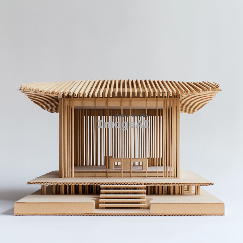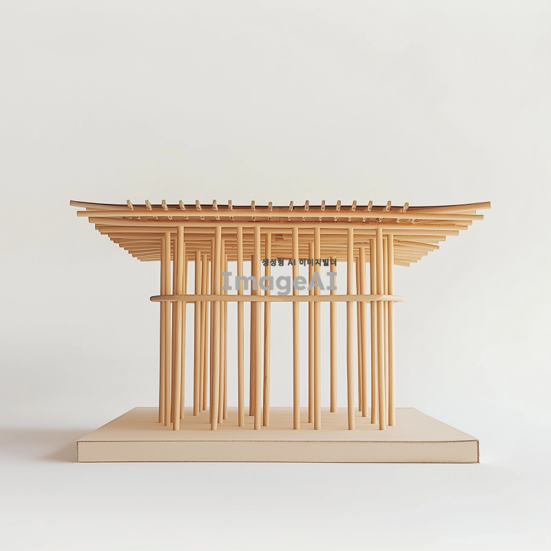 나무젓가락과 골판지를 사용하여 만든 우드 파빌리온 모델, 간단한 구조, 배경 없음, 미니멀리즘 디자인, 자연스러운 나무 질감, 창의적인 건축물, 조화로운 색상, 현대적인 느낌, 정교한 디테일, 균형 잡힌 형태.