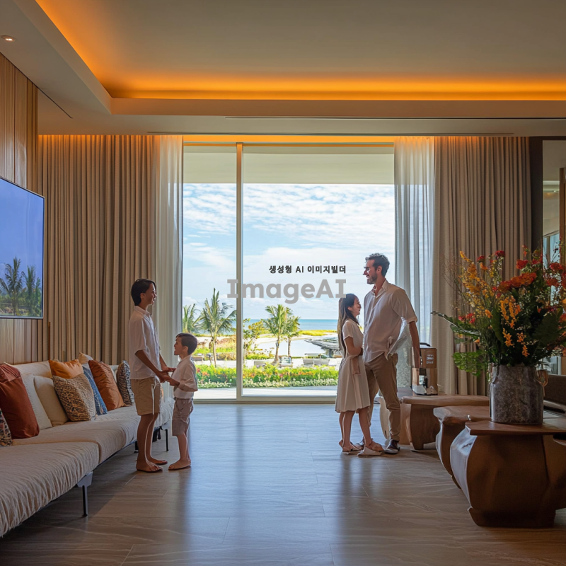 고급스러운 호텔 로비에서 환영받는 가족, 따뜻하고 친근한 분위기, 밝은 조명 아래에서 미소 짓는 가족 구성원들, 호텔 직원이 환영 인사를 하는 장면, 가족 여행의 즐거움과 편안함을 강조, 현대적이고 세련된 인테리어, 다채로운 색상의 꽃 장식, 편안한 소파와 테이블이 배치된 로비, 환영 음료가 준비된 모습, 가족 모두가 행복하게 대화를 나누는 순간.