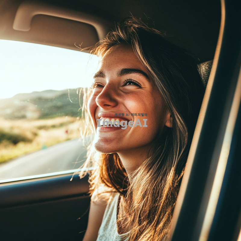 차타고 여행가는 기쁜사람. 사진구도는 창문을 보는 사람의 얼굴이 보이도록. 여행을 가서 설레고 기쁜 웃고있는사람