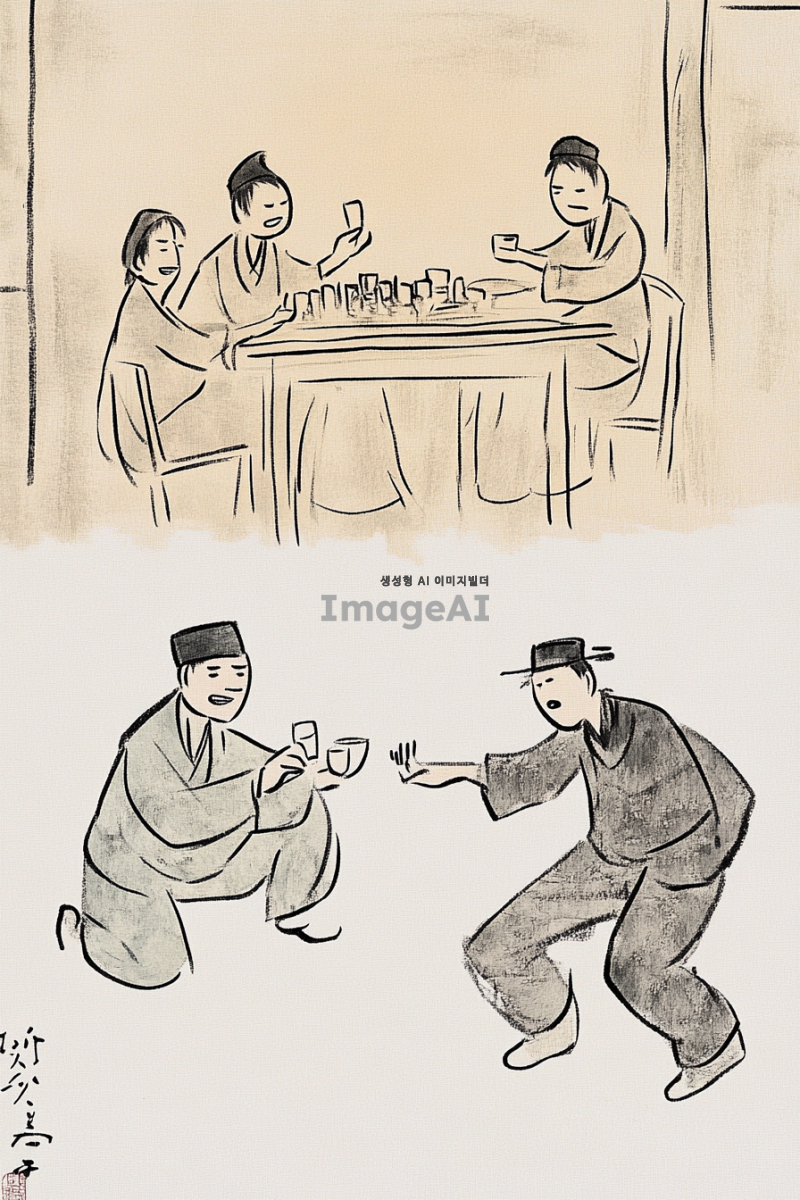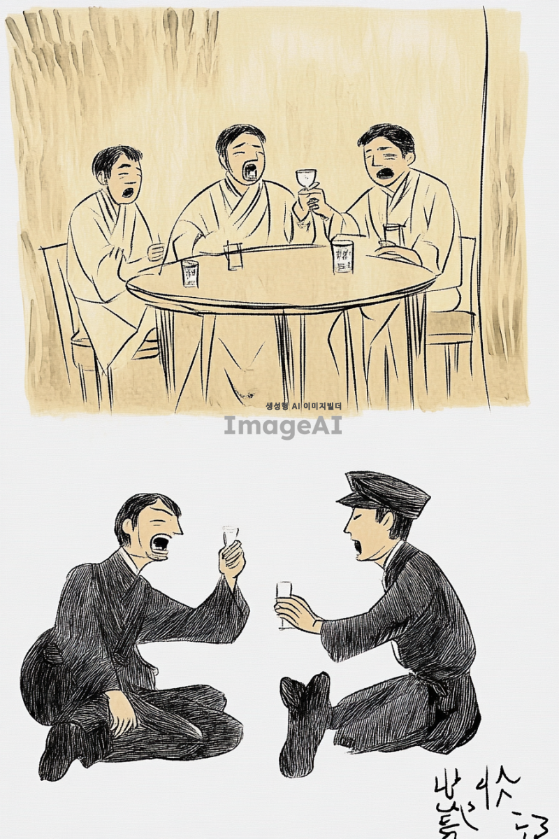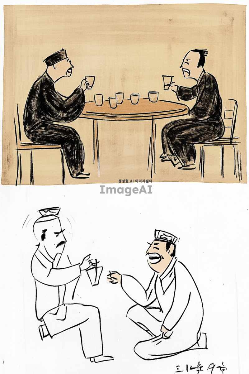 독립운동 영상 공모전에서 사용할 이미지. 자막으로 '오늘의 동료가 내일의 적이 될 수도 있고'라는 문구가 나오고 그 옆에 쓸 이미지가 필요함. 이미지는 직사각형 세로 사이즈에 2분할로 나눠서 위에는 경성시대 복장을 한 두 남자가 테이블에 앉아 서로 즐겁게 웃으며 술잔을 부딪히는 장면, 아래에는 한 남자는 일본 순사 사이에 무릎이 꿇린 채 분노한 얼굴로 자신을 내려다 보며 웃고 있는 남자를 노려보는 장면으로 그려줬으면 좋겠어.