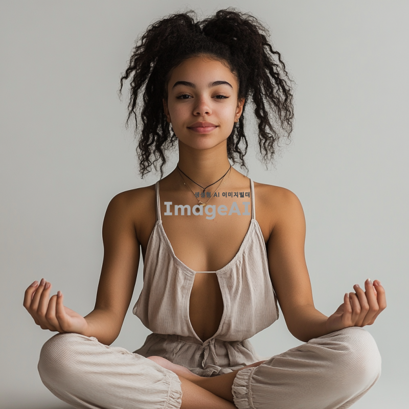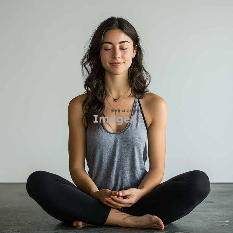 아빠다리로 편안하게 앉아있는 젊은 여성