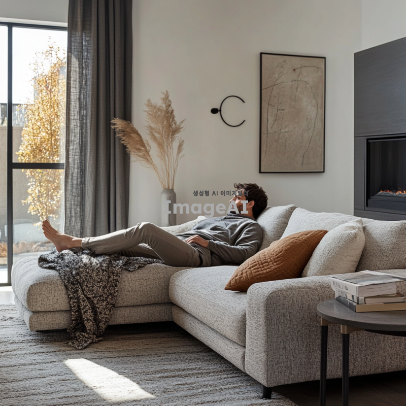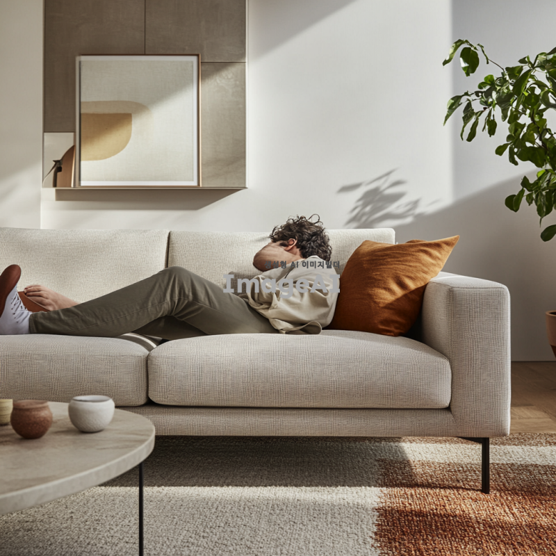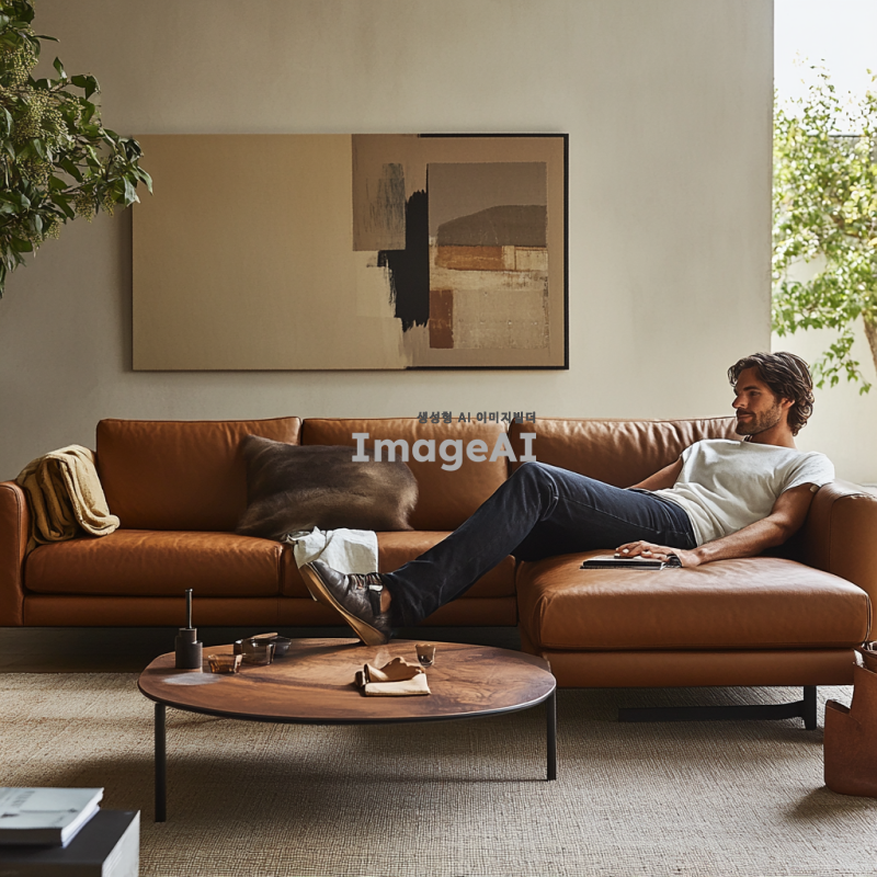 현대적인 거실에 위치한 세련된 디자인의 소파에 한쪽 다리만 올리고 편안하게 앉아있는 사람,
