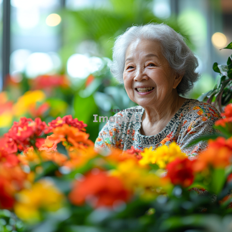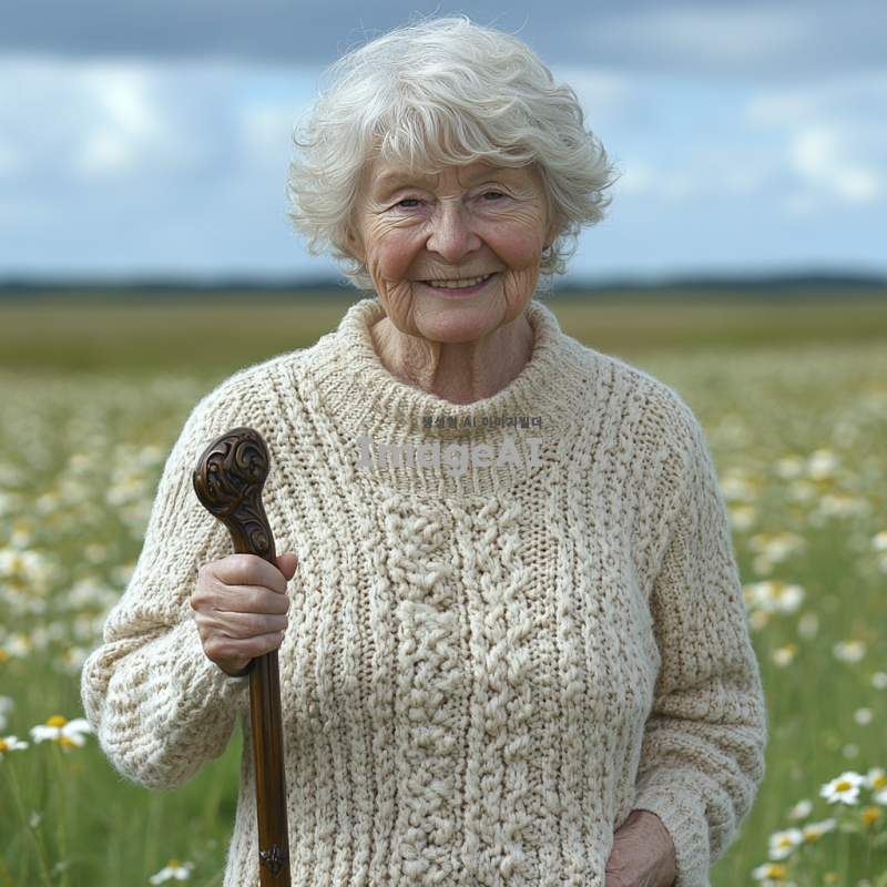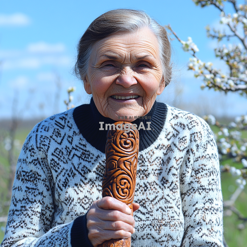 밝고 따뜻한 미소를 짓고 있는 할머니, 손에는 아름다운 조각이 새겨진 우아한 지팡이를 들고 있음, 할머니의 주름진 얼굴에는 인자함과 지혜가 느껴짐, 부드러운 햇살이 비치는 정원에서, 주변에는 다양한 꽃들이 피어 있는 장면, 할머니의 의상은 전통적인 무늬가 있는 따뜻한 색상의 스웨터와 편안한 바지, 배경은 푸른 하늘과 푸르른 나무들로 가득찬 평화로운 분위기.