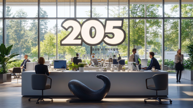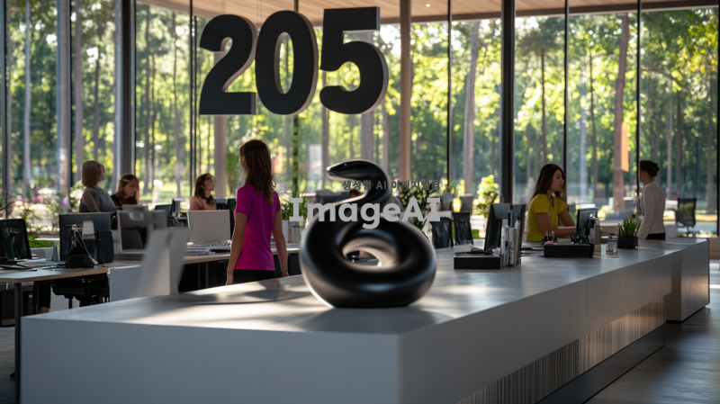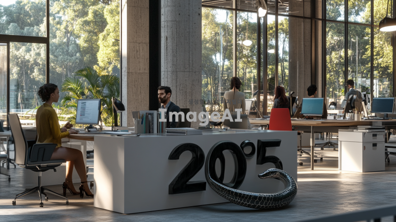 현대적인 사무실에서 다양한 사람들이 각자의 자리에서 집중하여 업무를 수행하고 있는 장면, 사무실 중앙에는 2025라는 숫자가 크게 쓰여 있고, 그 아래에는 거대한 뱀 모양의 석상이 세워져 있는 모습, 석상은 세련되고 예술적으로 조각되어 있으며, 사무실의 인테리어와 조화를 이루고 있음, 창문을 통해 자연광이 부드럽게 들어오는 분위기, 전체적인 색감은 차분하고 전문적인 느낌을 주는 톤으로 구성.