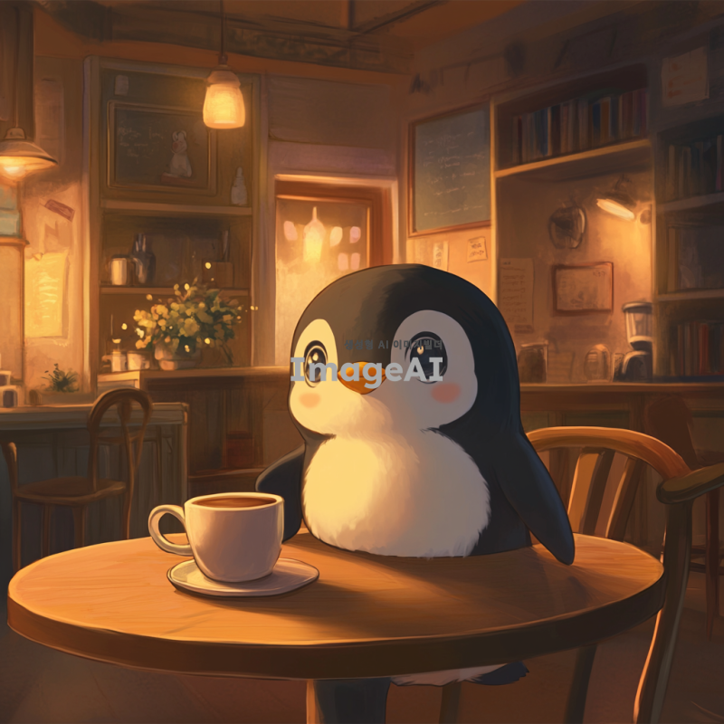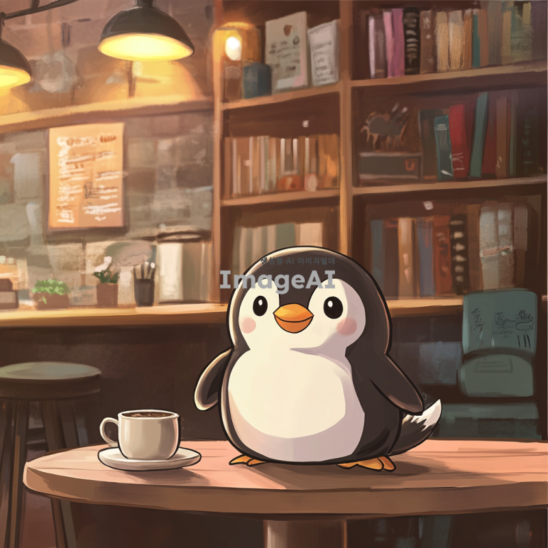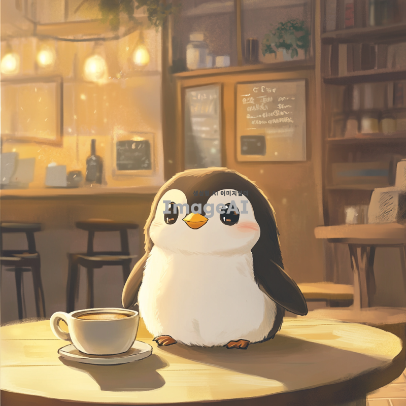 카페에서 대화를 나누고 있는 귀여운 만화 스타일의 펭귄 캐릭터, '대학일기' 웹툰과 유사한 아기자기한 그림체, 펭귄은 테이블에 앉아 커피잔을 앞에 두고 있으며, 따뜻하고 아늑한 카페 분위기, 부드러운 색감과 친근한 표정, 배경에는 책장과 조명이 어우러진 실내 인테리어