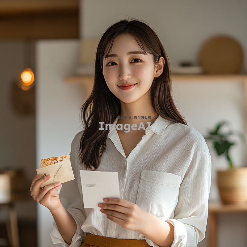30대 중반 한국인 여성, 왼손에 편지를 들고 오른손에 과자를 들고 있는 모습, 수줍은 미소를 짓고 서 있는 장면 가정집에서 자연스러운 포즈, 캐주얼한 복장, 부드러운 조명, 배경은 심플하고 깔끔한 스타일.