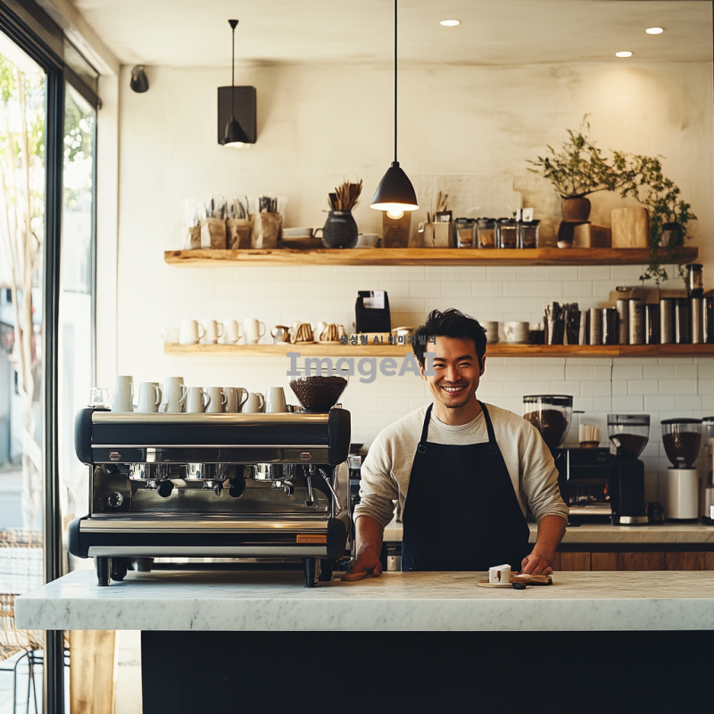 성공적인 카페 사장님이 운영하는 세련된 카페 내부, 현대적이고 우아한 인테리어 디자인, 카운터 뒤에서 미소 짓는 사장님, 잘 정돈된 커피 머신과 다양한 커피 원두가 진열된 선반, 깔끔하고 아늑한 좌석 배치, 창문을 통해 들어오는 자연광, 고객들이 편안하게 대화하는 모습, 고급스러운 느낌의 장식 요소들, 사장님의 자신감 있는 표정과 프로페셔널한 분위기.