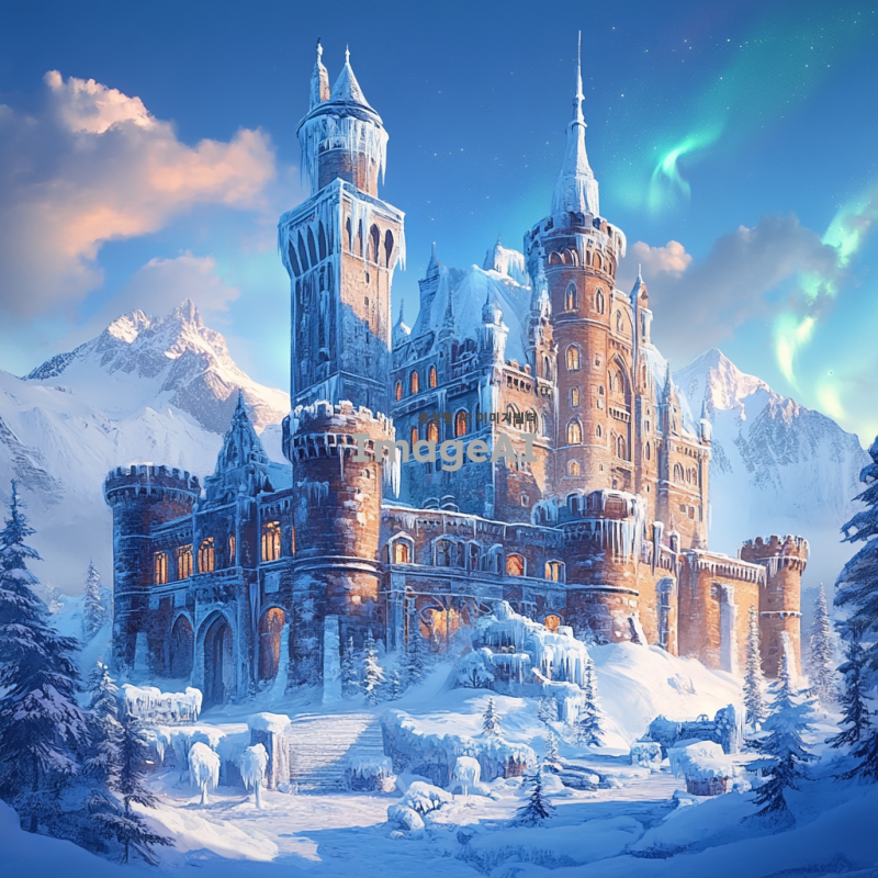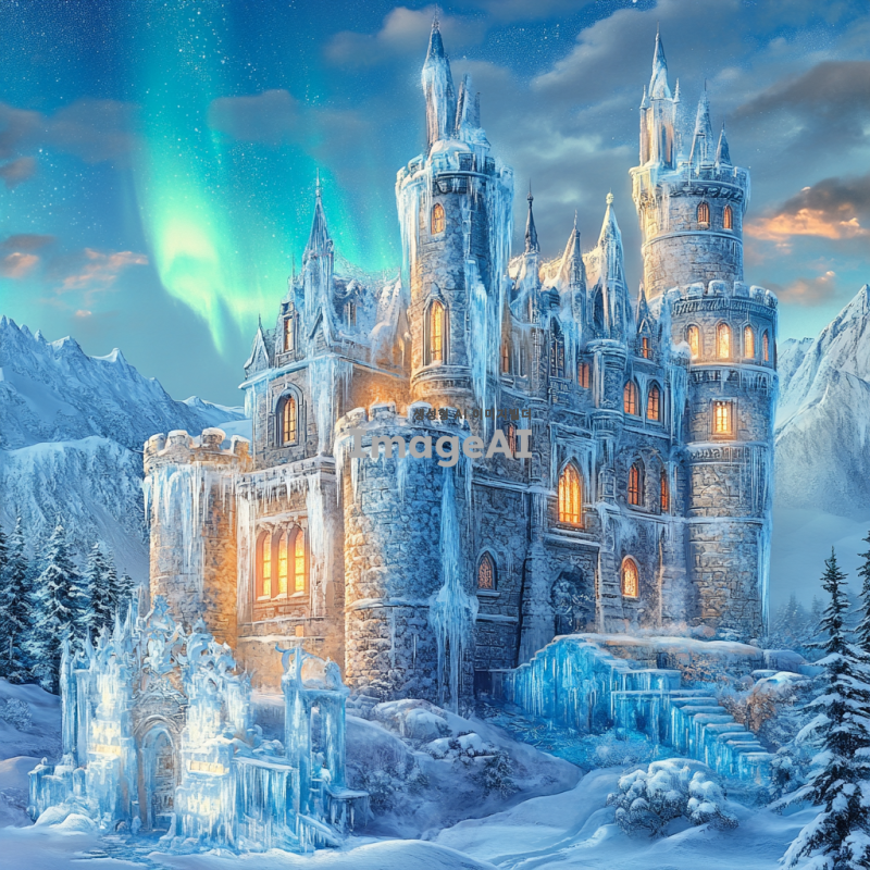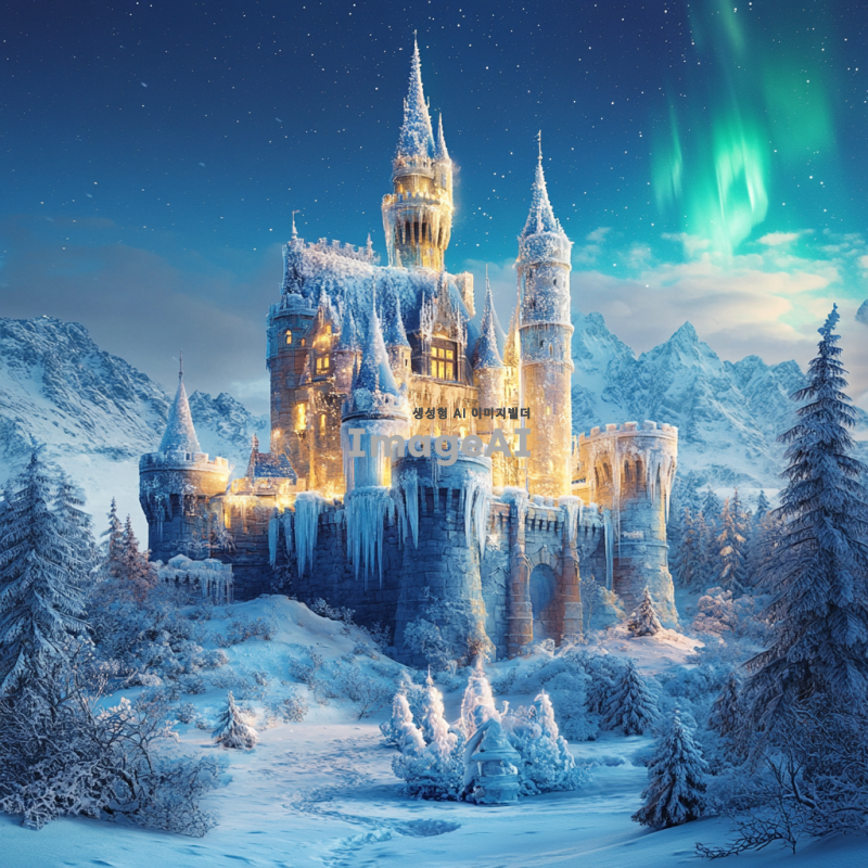 겨울의 신비로움을 담은 중세 유럽 스타일의 성, 눈 덮인 풍경 속에 자리 잡고 있으며, 성의 탑과 벽은 얼음과 눈으로 장식되어 반짝임. 주변에는 눈송이가 흩날리고, 얼음 조각으로 만들어진 정교한 조각상들이 성 주변을 둘러싸고 있음. 푸른 하늘 아래, 은은한 북극광이 하늘을 수놓고 있어 몽환적인 분위기를 자아냄. 성의 창문에서는 따뜻한 빛이 새어 나와 차가운 겨울 풍경과 대조를 이루며 아늑함을 더함.