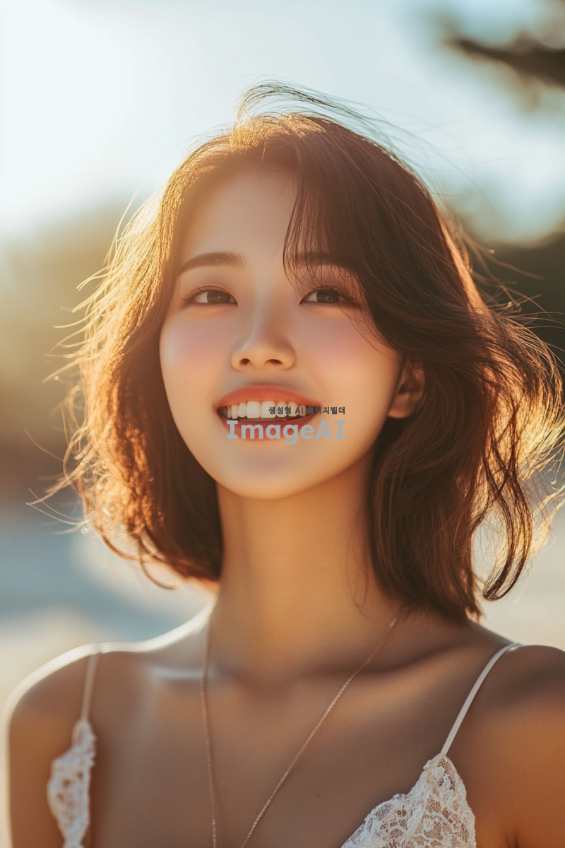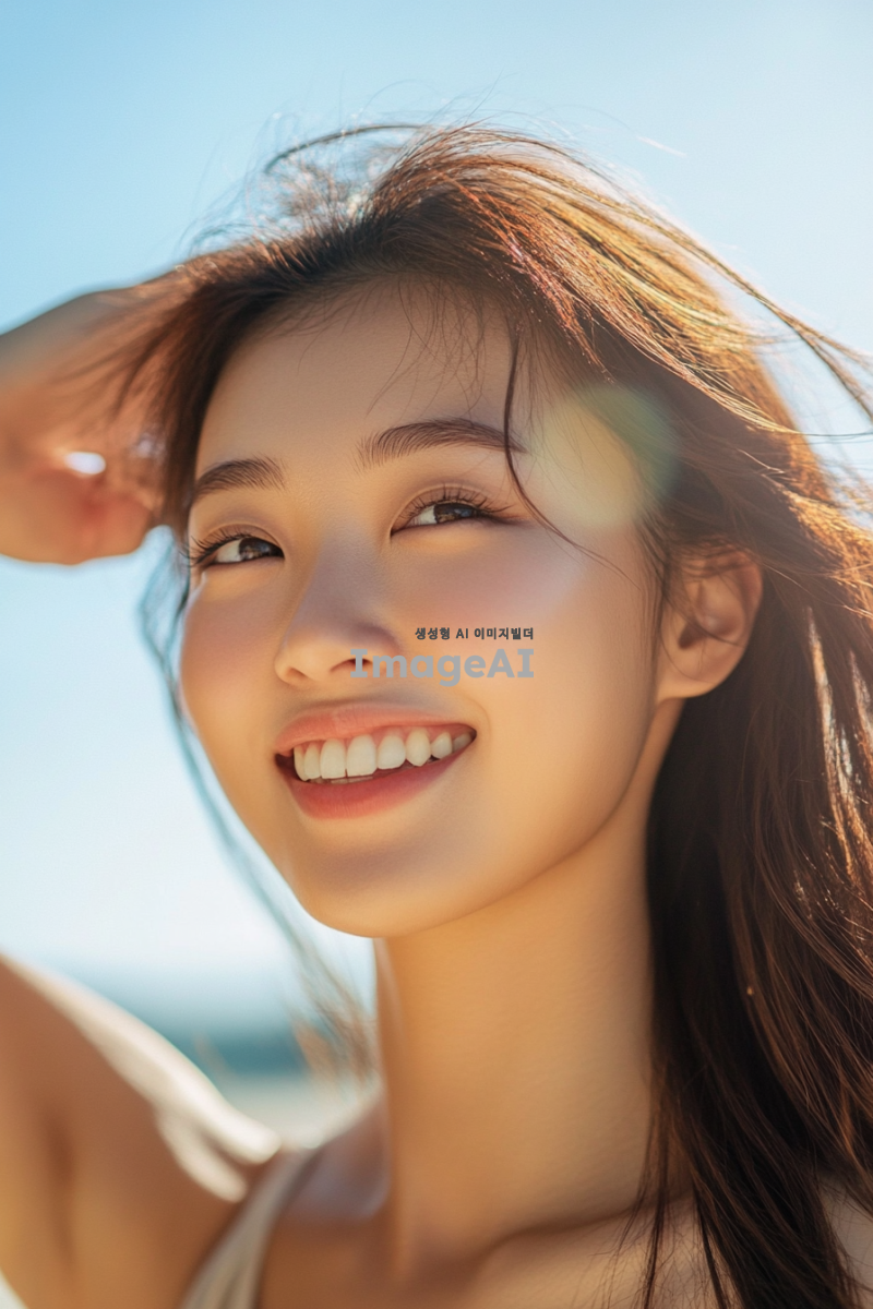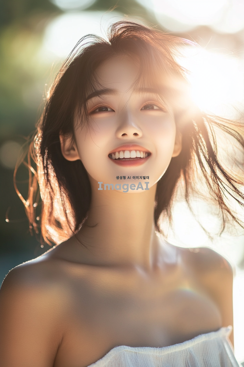 밝은 햇살 아래에서 선크림을 바른 아름다운 한국 여성이 미소를 지으며 카메라를 바라보고 있는 장면. 그녀의 피부는 건강하고 빛나며, 화장품 광고 모델인 그녀는 상반신 전체가 보인다
