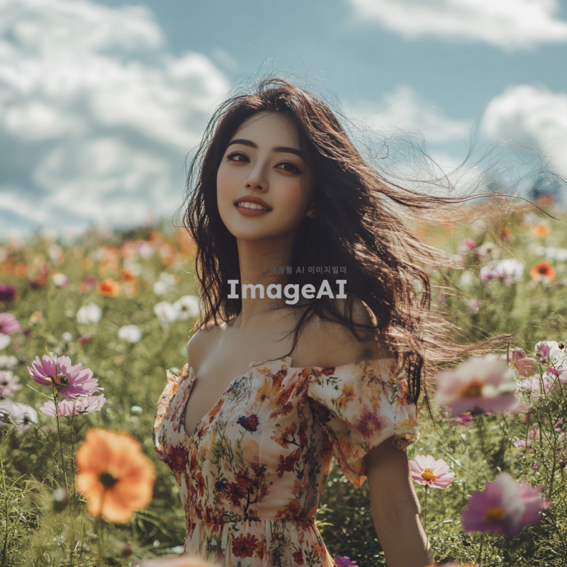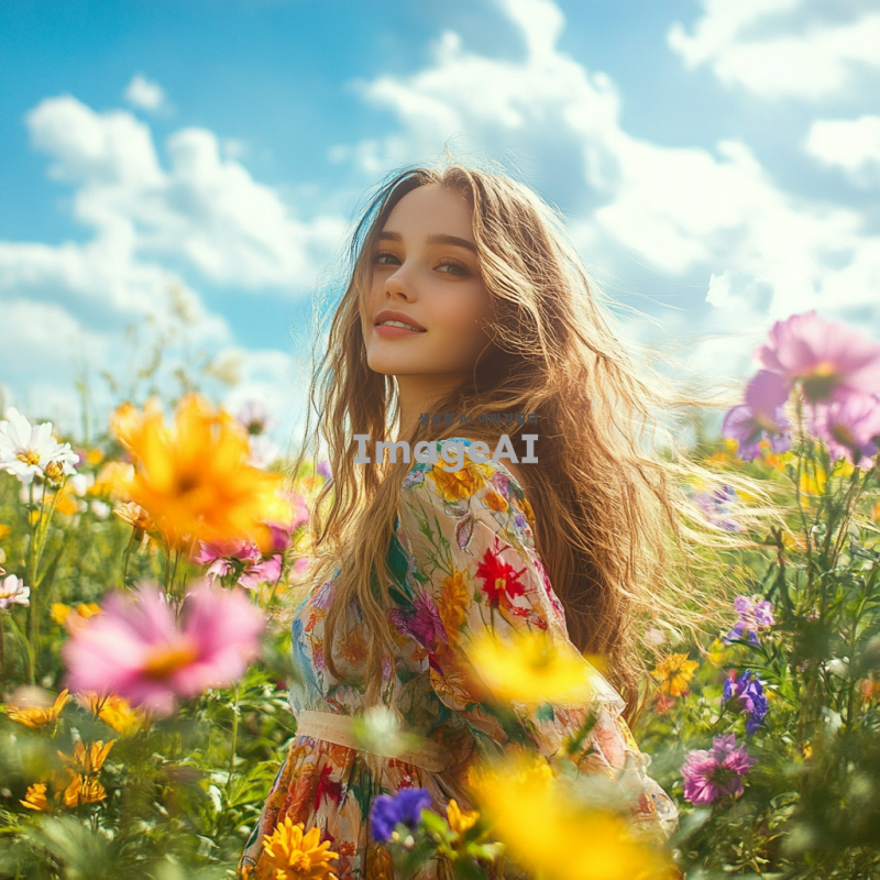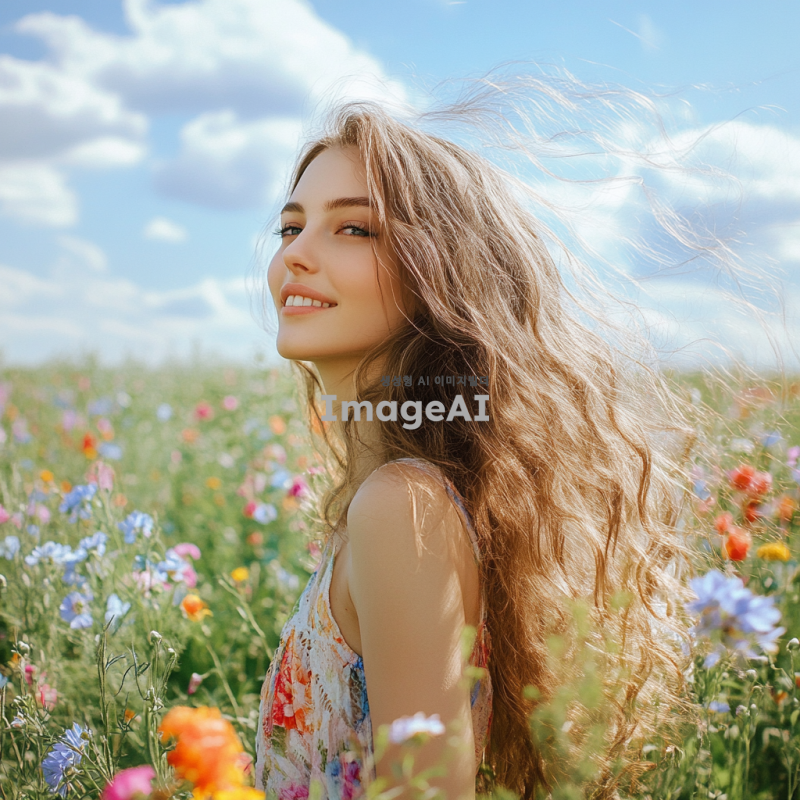 밝은 햇살 아래 꽃밭에 서 있는 아름다운 여성, 긴 웨이브 머리카락이 바람에 흩날리며, 부드러운 미소를 짓고 있다. 그녀는 화사한 봄 드레스를 입고 있으며, 주변에는 다양한 색상의 꽃들이 만개해 있다. 배경은 푸른 하늘과 흰 구름으로 이루어져 있으며, 자연의 평화로움이 느껴진다. 여성의 눈은 반짝이며, 전체적인 분위기는 따뜻하고 환영하는 느낌이다.
