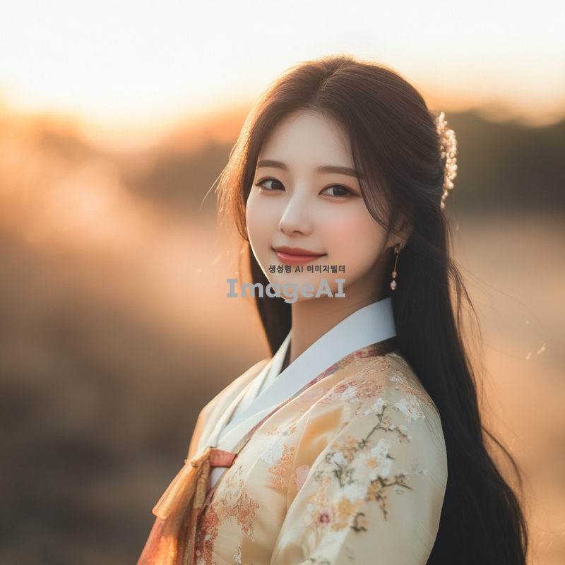 상반신이 전부 보이는 아름다운 한국 여성, 자연스럽고 부드러운 미소, 긴 검은 머리, 화사한 배경, 전통 한국 의상 한복을 입고 있는 모습, 따뜻한 햇살이 비치는 야외에서 촬영한 느낌, 현대적이면서도 전통적인 아름다움이 조화롭게 어우러진 이미지.