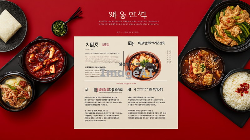 한국 스타일의 중식당 메뉴판, 빨간색을 주요 색상으로 사용하여 전통적인 중식당의 분위기를 강조. 메뉴 항목으로는 짜장면, 짬뽕, 볶음밥, 탕수육 등을 포함하며, 각 요리의 이미지와 함께 한글로 메뉴 이름과 가격이 명확하게 표시. 메뉴판의 레이아웃은 깔끔하고 직관적이며, 각 요리의 이미지가 식욕을 돋울 수 있도록 생생하고 맛있게 표현. 전통적인 중식당의 느낌을 살리기 위해 붉은색 배경에 금색이나 흰색 글씨를 사용하여 고급스러운 느낌을 더함.