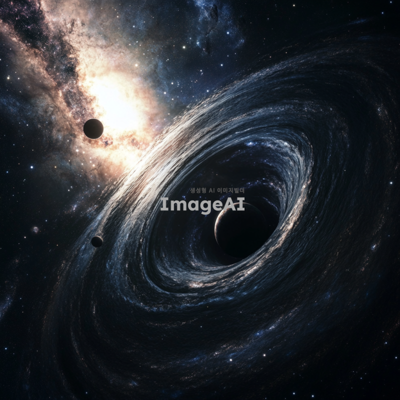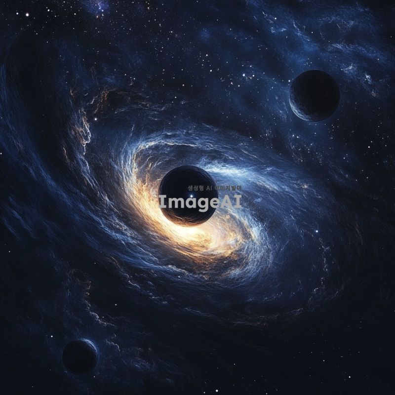 우주 공간에 떠 있는 블랙홀 행성계, 주변에 회전하는 다양한 크기의 행성들, 강렬한 중력에 의해 휘어진 빛, 은하수와 별들이 배경에 펼쳐진 모습, 신비롭고 장엄한 분위기, 어두운 색조와 강렬한 대비, 과학적이면서도 예술적인 표현.