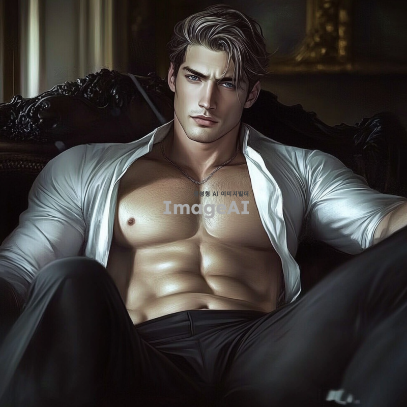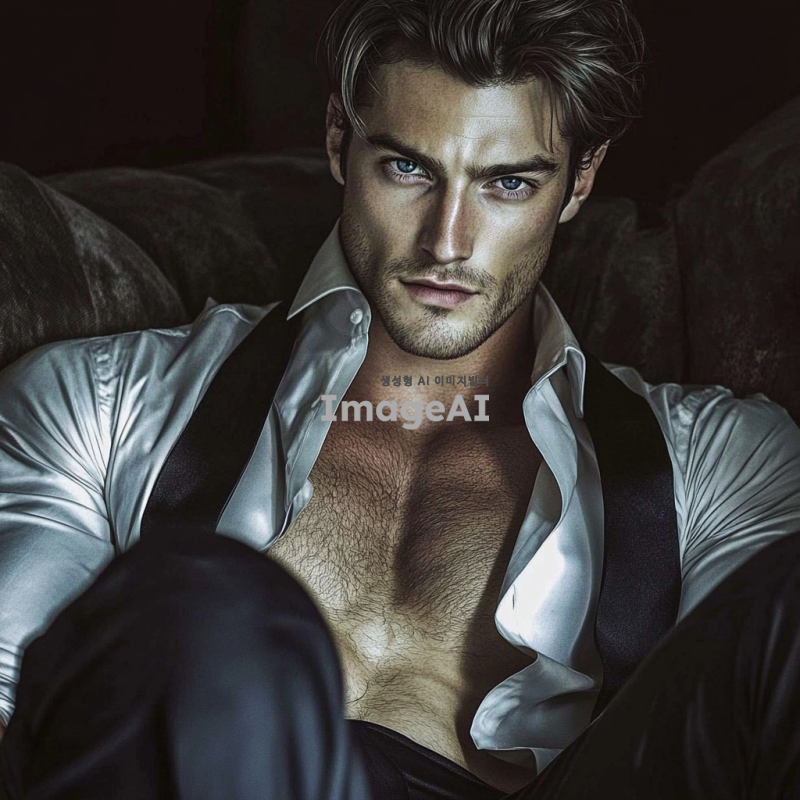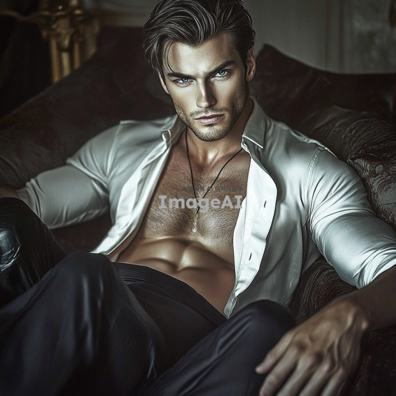 30대의 금발에 파란 눈동자와 검은 머리, 창백한 피부를 가진 잘생긴 남자가 단추를 풀어놓은 흰 셔츠와 짙은 회색 바지를 입고 소파에 앉아 있다.