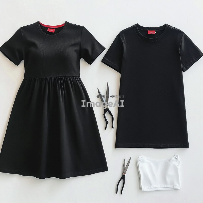 검은색 원피스와 검은색 반팔 티셔츠, 흰색 반팔 티셔츠가 나란히 놓여 있는 이미지. 각 의류는 가위로 잘린 부분이 명확하게 보이도록 표현. 배경은 깔끔한 흰색으로 설정하고, 각 의류의 질감과 색상이 선명하게 드러나도록 강조. 가위는 의류 옆에 놓여 있으며, 잘린 부분의 디테일이 잘 보이도록 세밀하게 묘사.