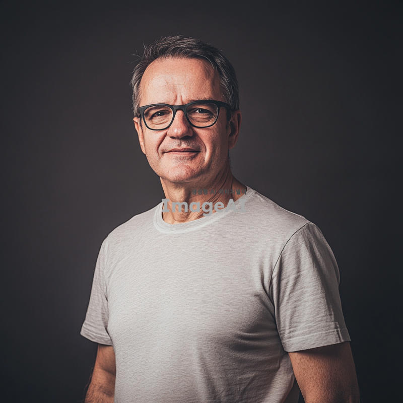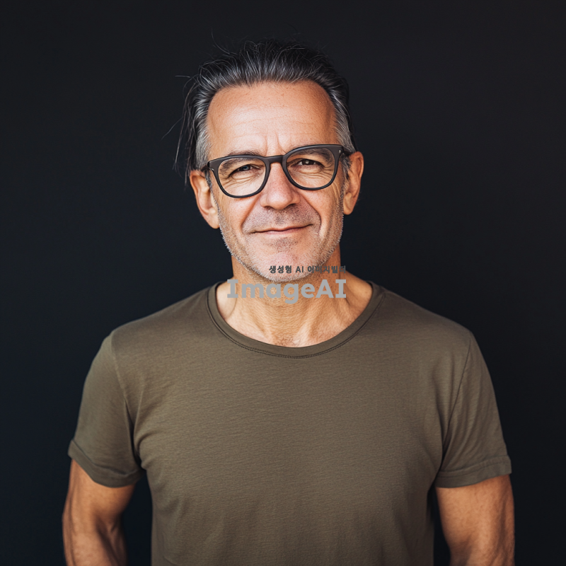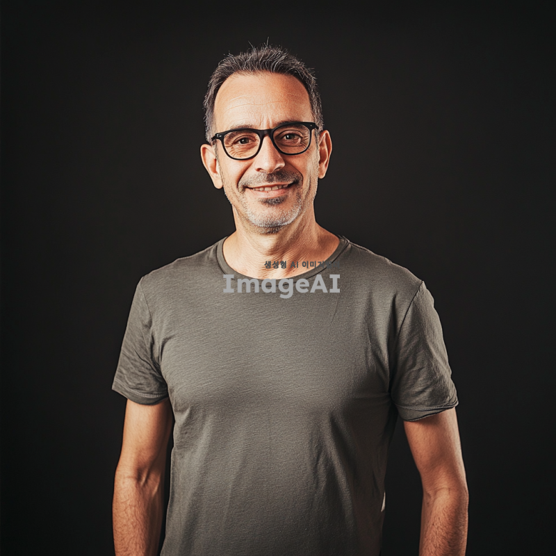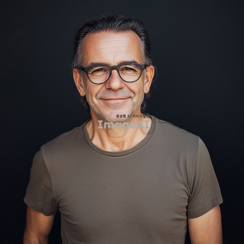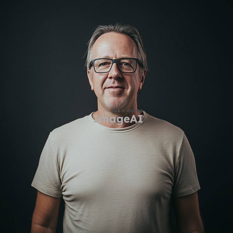 중년 남성이 머리를 묶고 있으며, 편안하게 늘어진 반팔 티셔츠를 입고 안경을 쓰고 있는 모습. 그의 표정은 친근하며, 전체적으로 캐주얼하고 자연스러운 분위기를 연출. 배경은 일상적인 어두운 공간으로, 아늑하고 편안한 느낌을 줌.