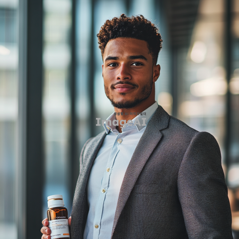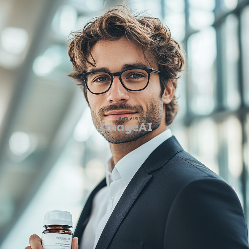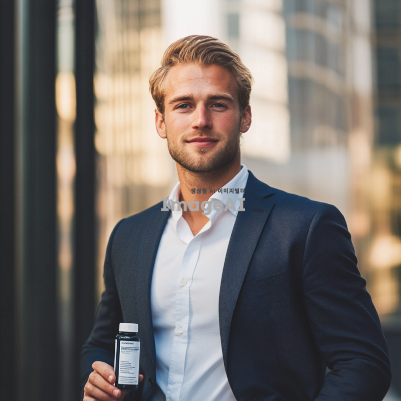 세련된 정장 수트를 입고 있는 젊고 지적인 남성, 현대적인 도시 배경, 남성은 친근하고 자신감 있는 표정, 자연광이 비치는 실내 환경, 깔끔하고 프로페셔널한 분위기, 남성의 손에는 영양제 병이 들려 있으며, 건강하고 활기찬 이미지 강조.