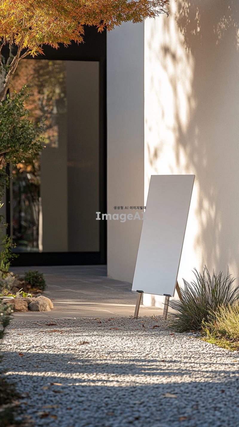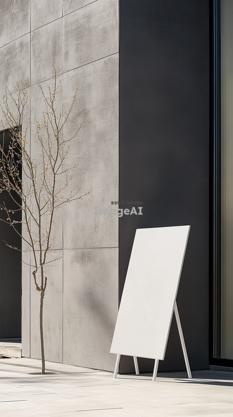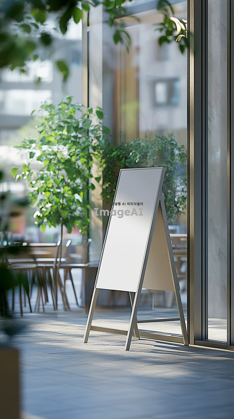 A형 철제 입간판, 손잡이 없이 일체형으로 제작된 깔끔한 디자인, 매끄러운 표면과 견고한 구조, 현대적이고 미니멀한 스타일, 실내외 사용 가능, 중성적인 색상 팔레트, 직선적이고 간결한 라인, 주변 환경과 조화롭게 어우러지는 모습, 실용적이고 세련된 느낌.
