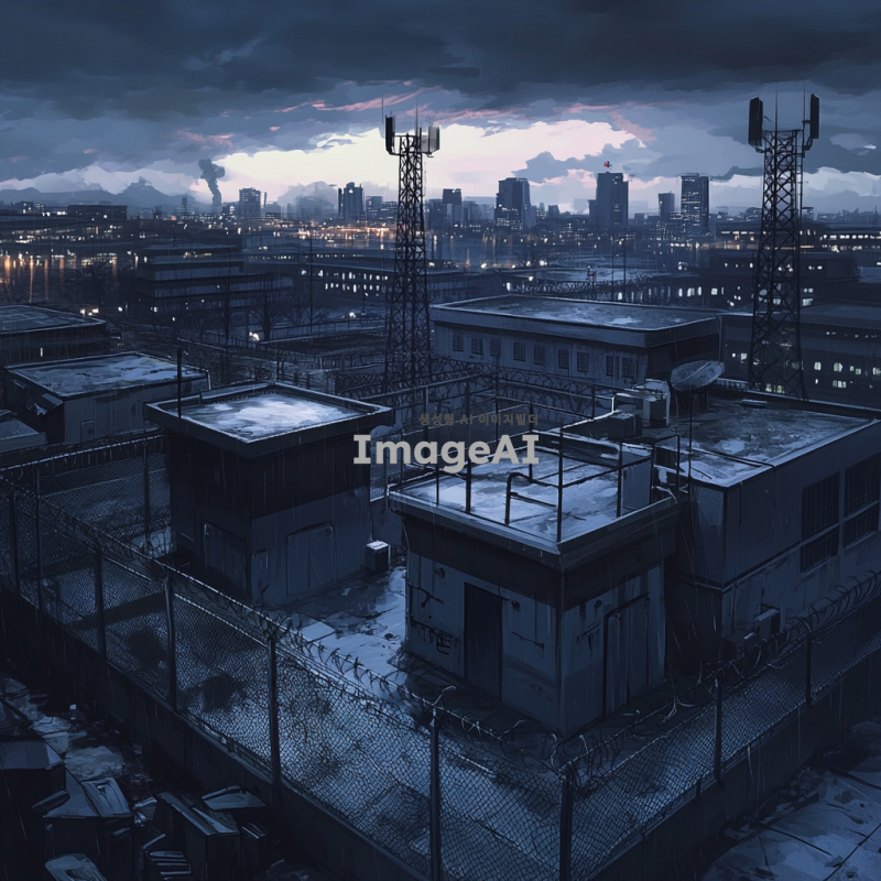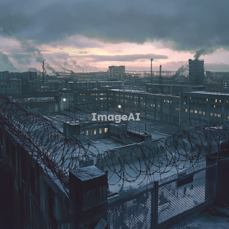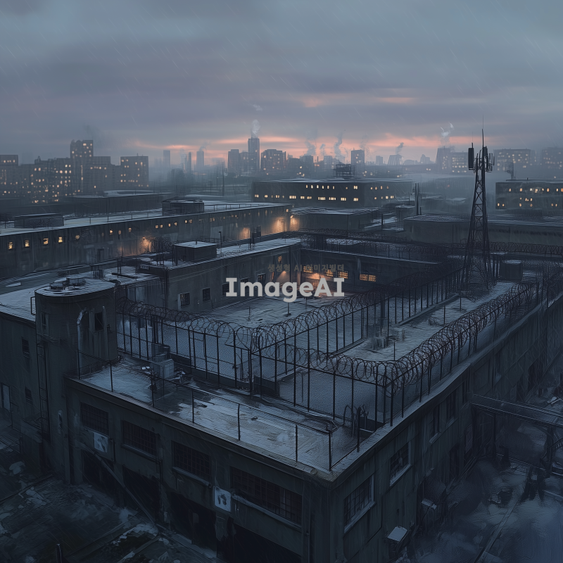 황혼의 빛이 감도는 하늘 아래, 높은 건물들과 철조망으로 둘러싸인 교도소의 전경. 옥상에서 내려다본 시점으로, 넓게 펼쳐진 교도소 안의 운동장과 여러 시설물들이 보이며, 주변에는 경비 초소와 감시카메라가 배치되어 있다. 건물들은 주로 회색이나 짙은 색조로 표현되어 있으며, 차가운 느낌을 주는 강철과 콘크리트 재질이 돋보인다. 전체적으로 고요하면서도 긴장감이 감도는 분위기.