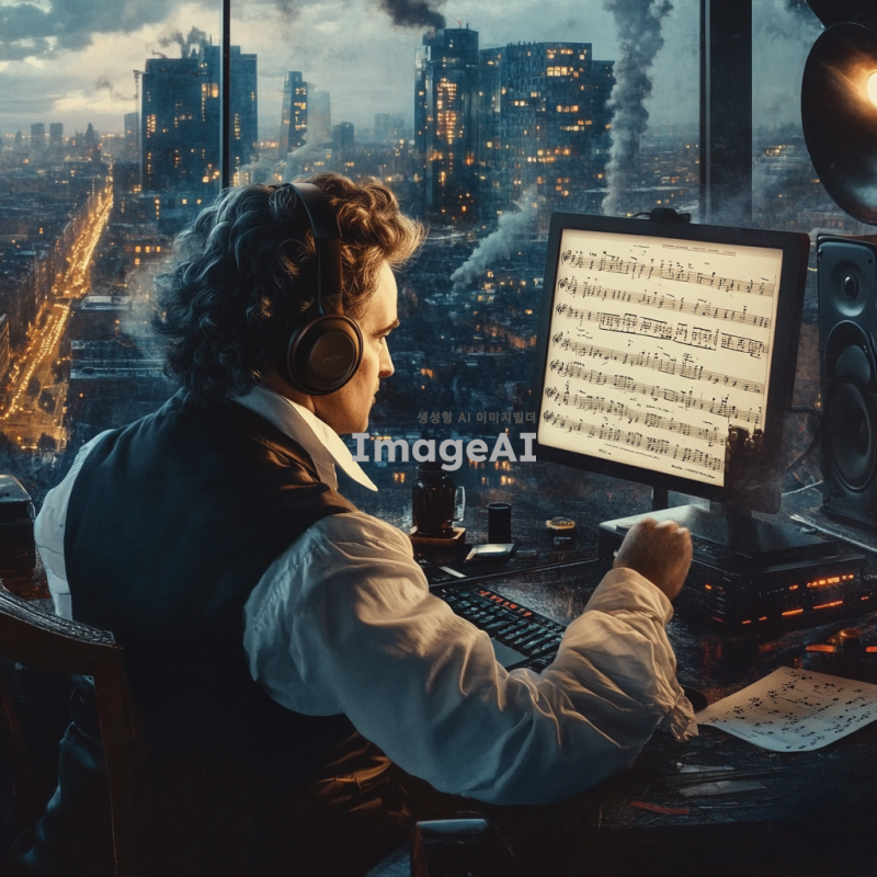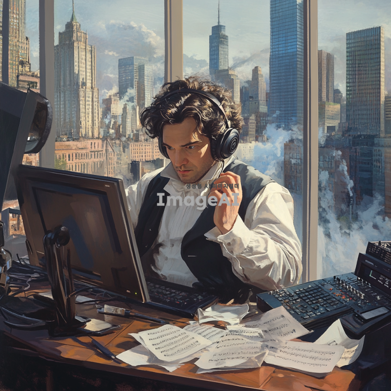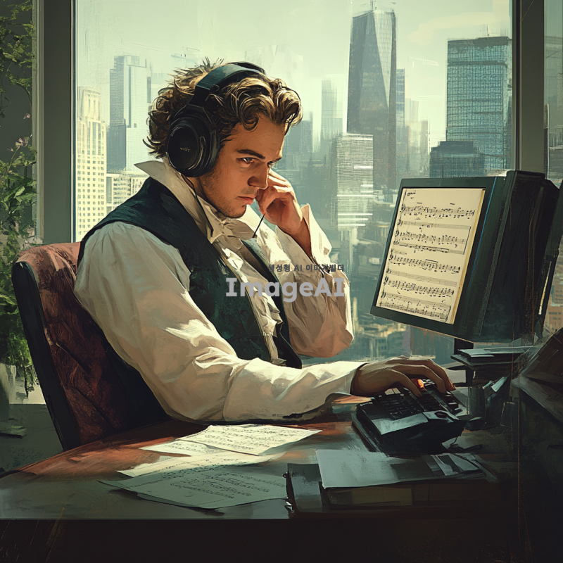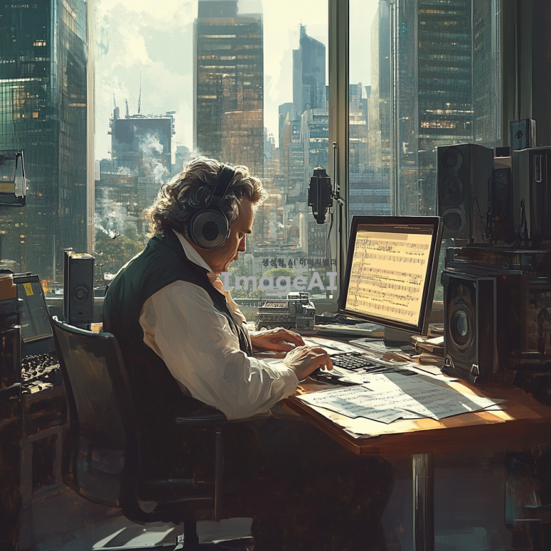 현대적인 음악 스튜디오에서 헤드폰을 착용하고 컴퓨터 앞에 앉아 있는 베토벤, 주변에는 최신 음악 장비와 악보가 흩어져 있으며 창문 밖으로는 현대 도시의 스카이라인이 보이는 장면, 베토벤은 집중한 표정으로 화면을 바라보고 있고, 그의 전통적인 복장과 현대적인 환경이 조화를 이루고 있음.