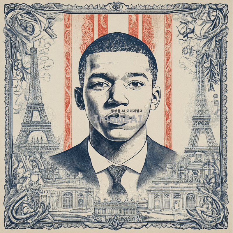 프랑스의 전통적인 디자인 요소와 현대적인 스타일이 조화를 이룬 지폐에 킬리안 음바페의 초상화가 중앙에 배치된 이미지. 음바페의 얼굴은 세밀하게 묘사되어 있으며, 배경에는 프랑스의 상징적인 건축물과 자연 경관이 섬세하게 그려져 있다. 지폐의 색상은 프랑스 국기를 연상시키는 파란색, 흰색, 빨간색의 조화를 이루고 있으며, 지폐의 모서리에는 프랑스의 유명한 문화적 아이콘들이 작게 장식되어 있다. 음바페의 이름과 숫자, 그리고 프랑스의 공식 문양이 지폐의 양쪽에 균형있게 배치된 모습.