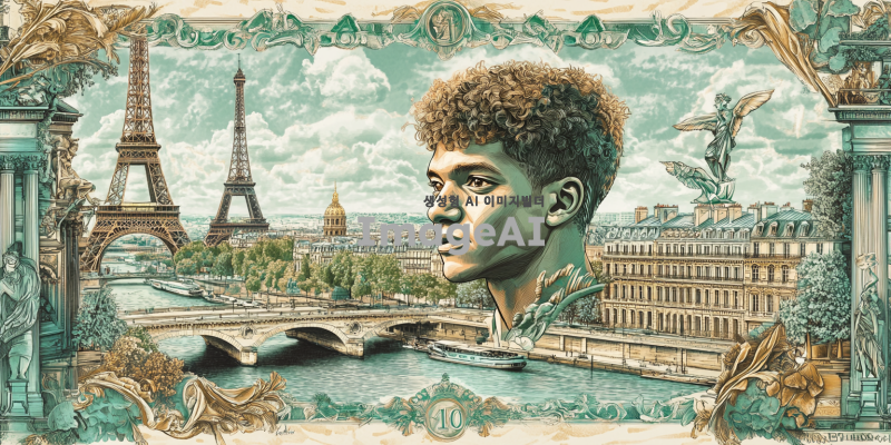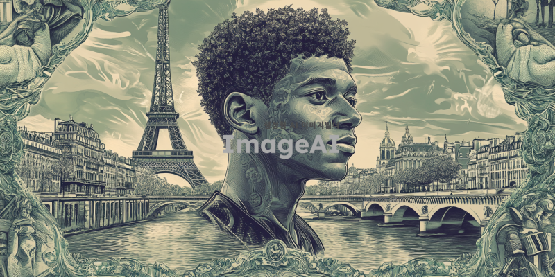 프랑스의 전통적인 지폐 디자인 스타일로, 중앙에는 킬리안 음바페의 초상화가 세밀하게 그려져 있고, 배경에는 프랑스의 상징적인 랜드마크인 에펠탑과 세느강이 조화롭게 배치된 200프랑짜리 지폐. 지폐의 색상은 클래식한 녹색과 푸른색 톤을 사용하여 전통적인 유럽 지폐의 느낌을 강조하고, 음바페의 초상화는 현대적인 터치로 세부 묘사를 통해 생동감 있게 표현. 지폐의 가장자리에는 프랑스의 국가 문양과 역사적인 요소들이 세밀하게 장식되어 있는 모습.