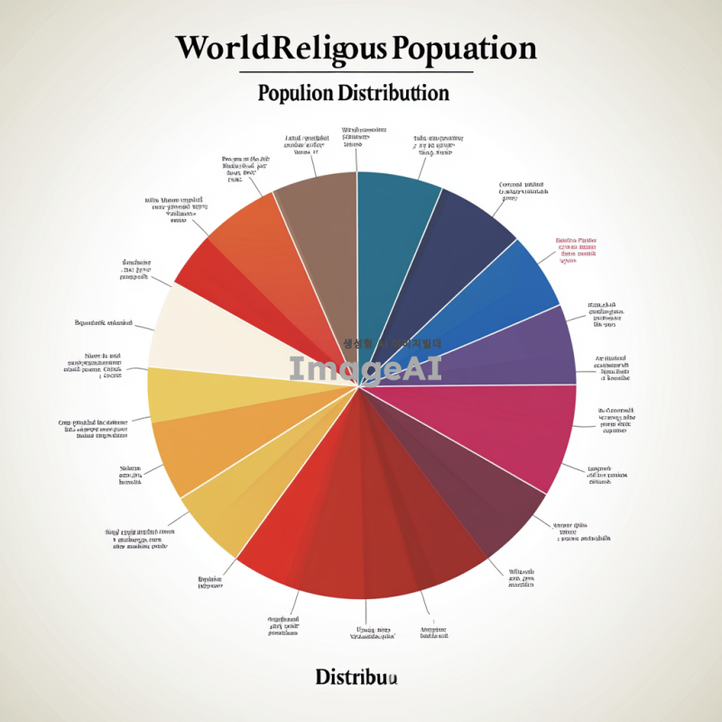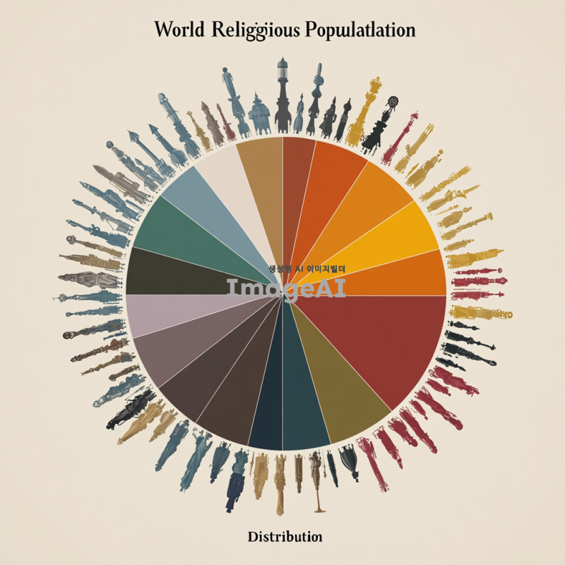 종교별 인구 수를 나타내는 원형 차트, 각 종교는 다른 색으로 구분되어 있으며, 기독교, 무슬림, 힌두교, 불교, 중국 민속 종교, 민족 종교, 신흥 종교, 시크교, 유대교 순으로 배열되어 있다. 차트 중앙에는 "세계 종교 인구 분포"라는 제목이 적혀 있다.