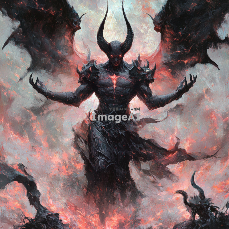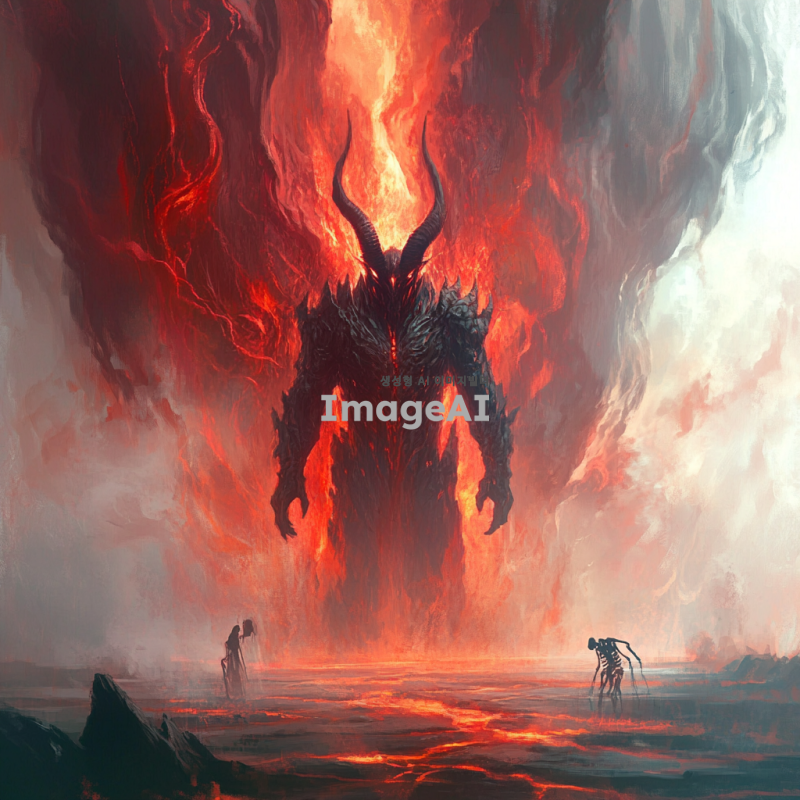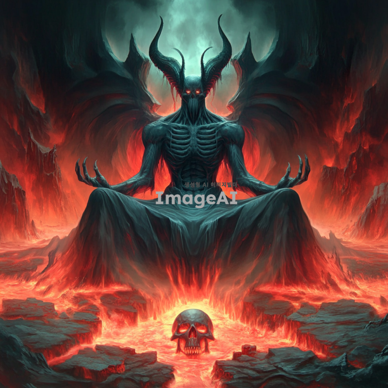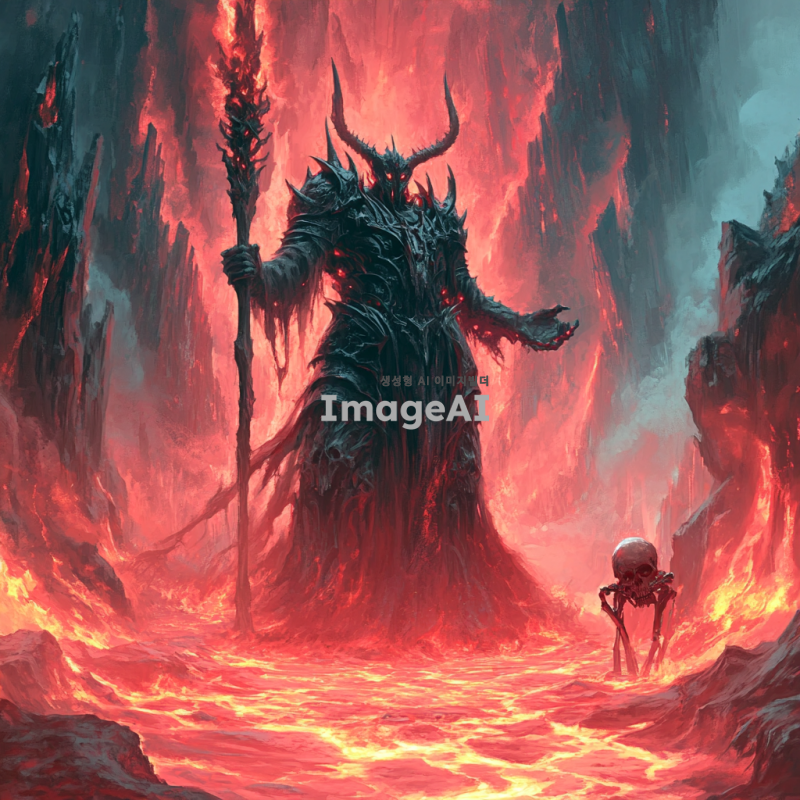 어둡고 불길한 분위기의 지옥의 왕, 위리놈을 묘사. 날카로운 뿔과 불타는 눈을 가진 위엄 있는 존재. 검은 갑옷을 입고 있으며, 그의 주위에는 불길과 연기가 피어오르는 모습. 손에는 강력한 지팡이나 검을 들고 있고, 그의 발밑에는 불타는 용암이 흐르는 지옥의 풍경. 배경은 붉고 검은 색조로 이루어진 혼돈의 세계. 위리놈 앞에 해골 드래곤이 있다