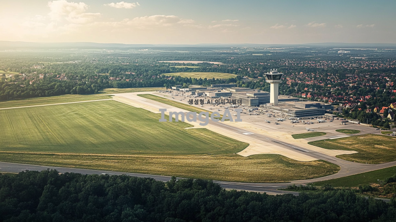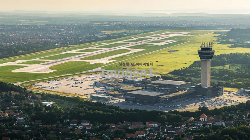 맑은 하늘 아래 펼쳐진 전원 마을과 넓은 밭, 오른쪽 끝에 위치한 항공 관제탑, 조화롭게 어우러진 풍경, 초록빛으로 물든 들판과 작은 집들이 점점이 놓인 모습, 평화롭고 조용한 분위기, 관제탑은 현대적인 디자인으로 강조, 전체적으로 따뜻한 색감과 부드러운 빛이 감도는 장면.