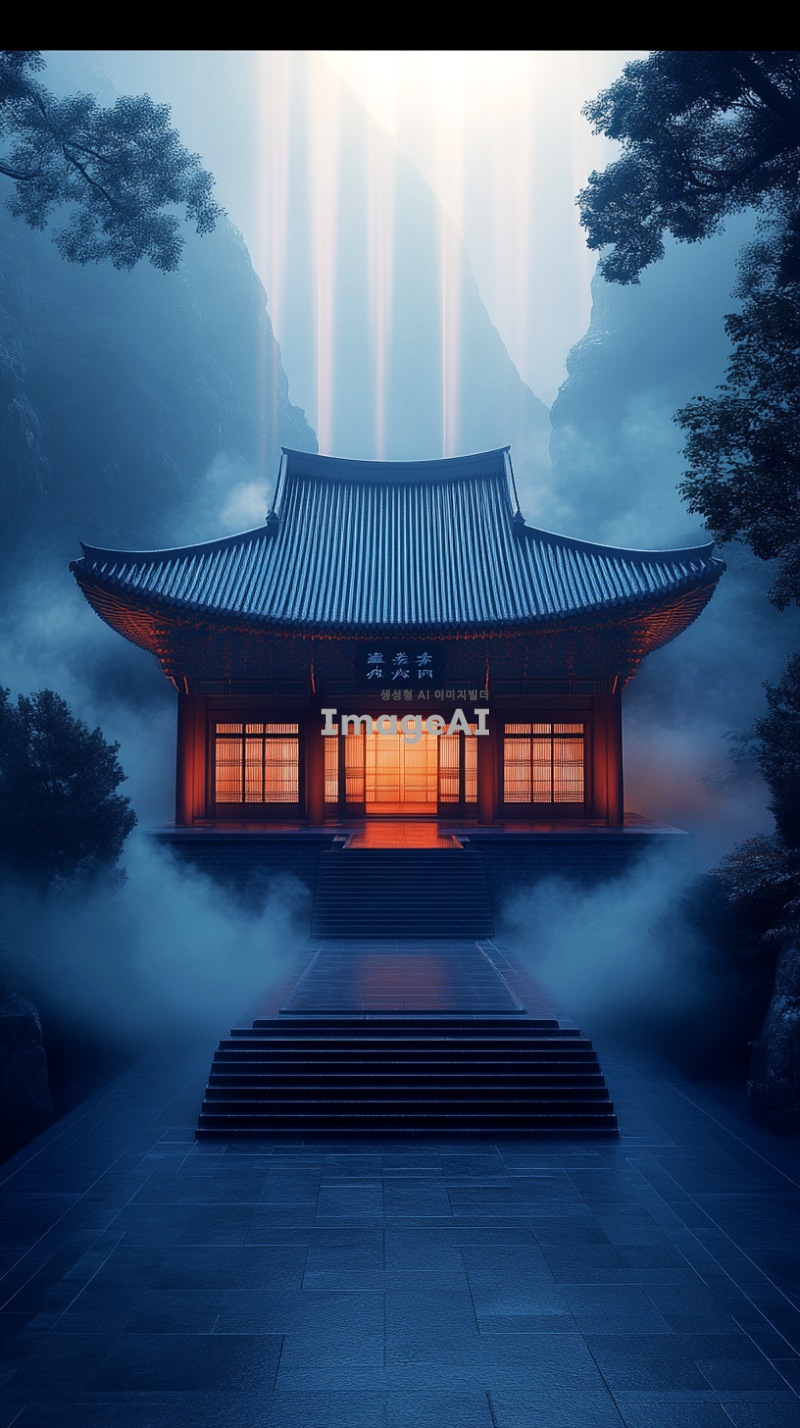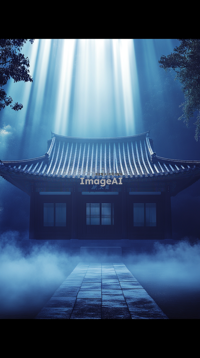 어두운 파란색 그라데이션 배경에 ‘한국의 한옥’이 안개와 연기에 둘러싸여 있다. 장면은 뒤에서 나오는 빛줄기에 의해 앞쪽에서 조명이 비춰진다. 신비로운 분위기가 전체 구성을 감싸고 있으며, 영화적 조명과 판타지 스타일을 가지고 있다.